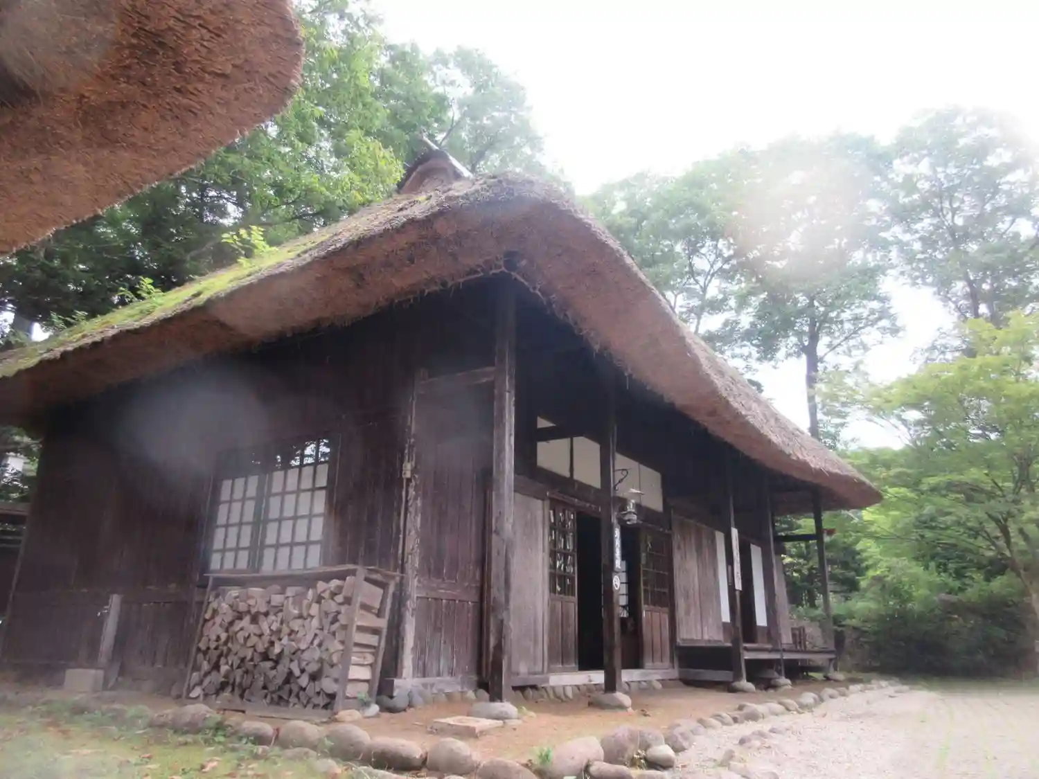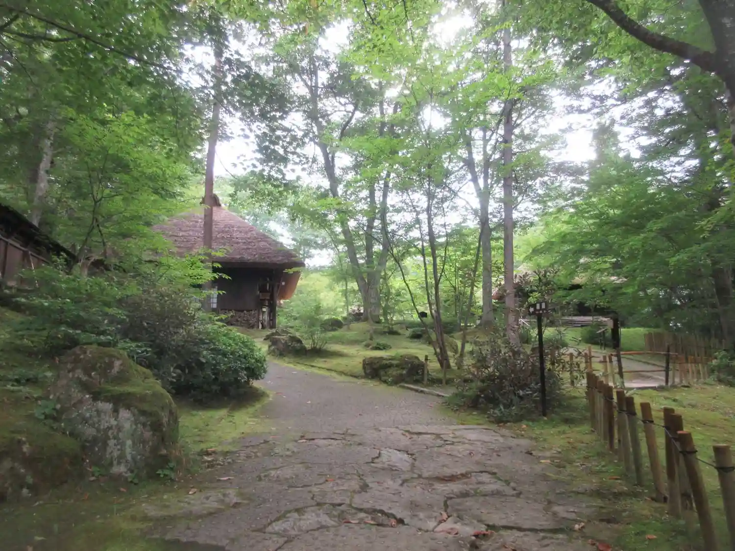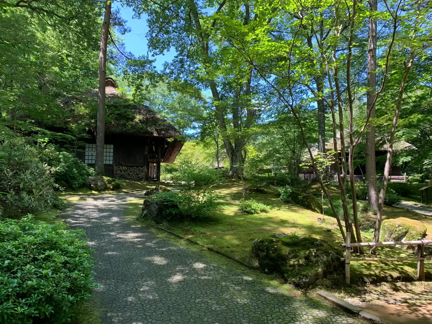 茅葺き屋根の家が緑の中にあります。