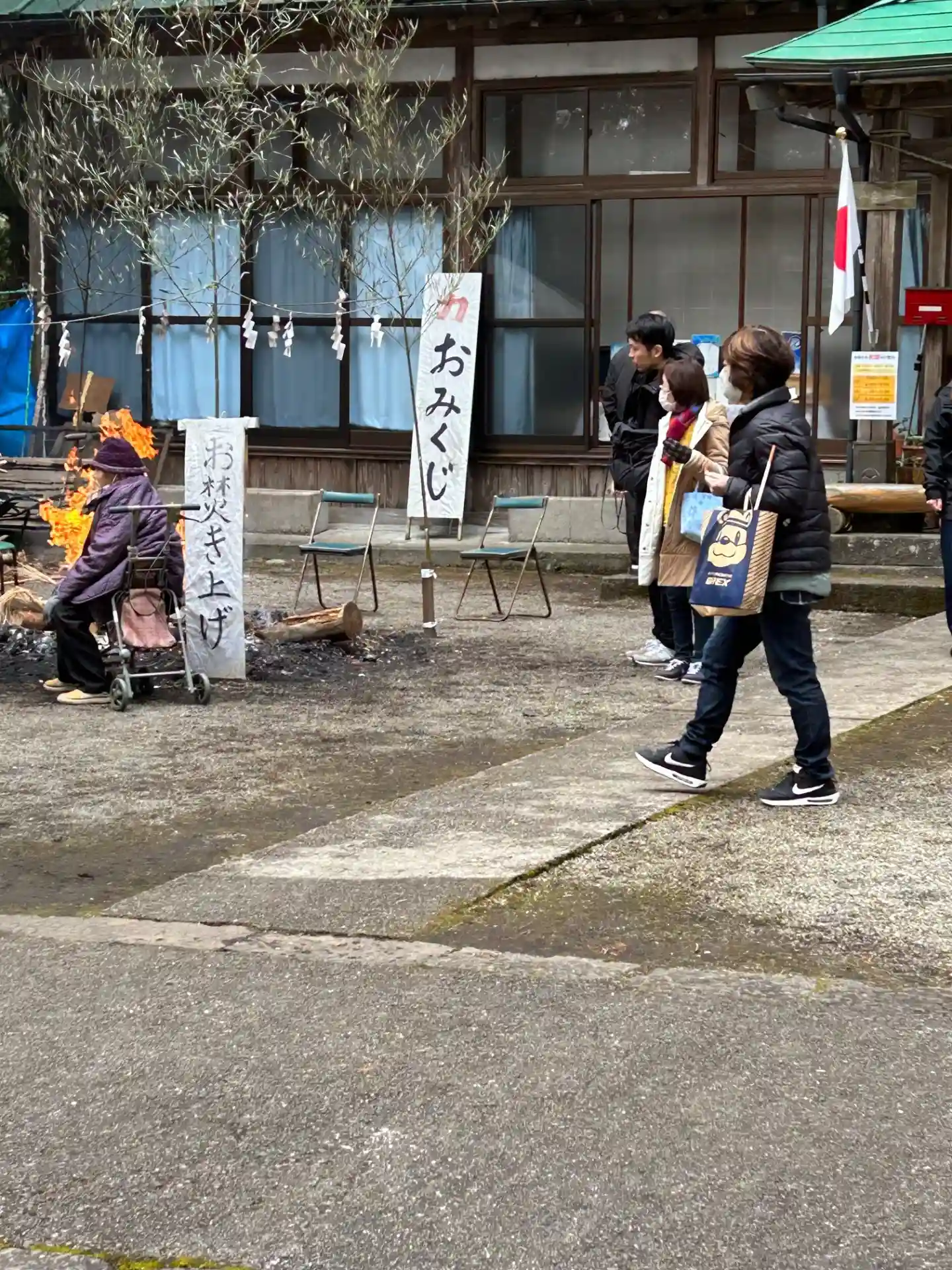 境内の焚き火にあたり、お振る舞いの甘酒を頂かないと…