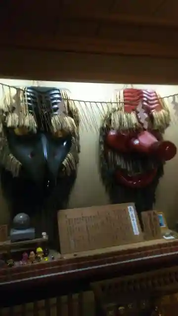 社の中、そこかしこに天狗のお面(?)が