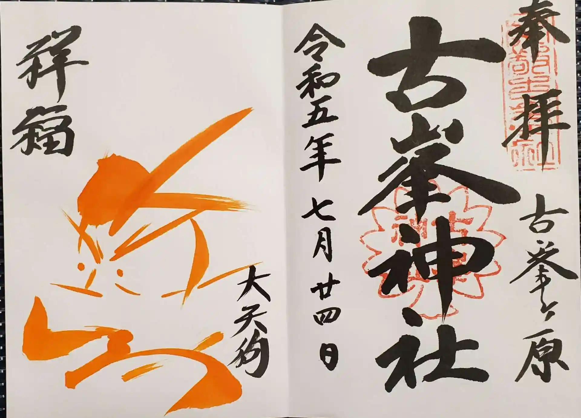 御朱印(直書き)。30分ほどかかりましたが、その日の担当の方がその時のデザインで書いてくださいます。左側は天狗。
