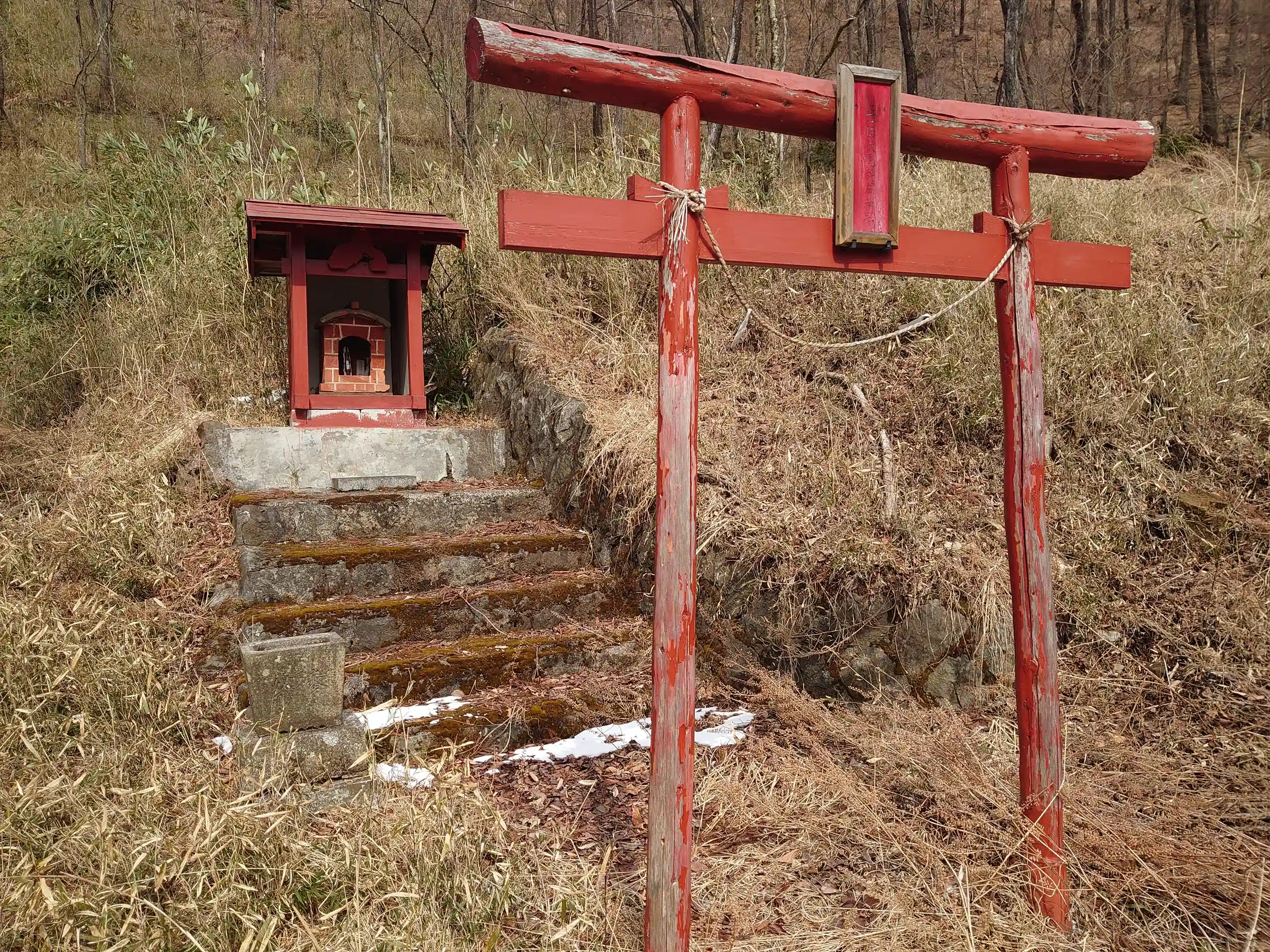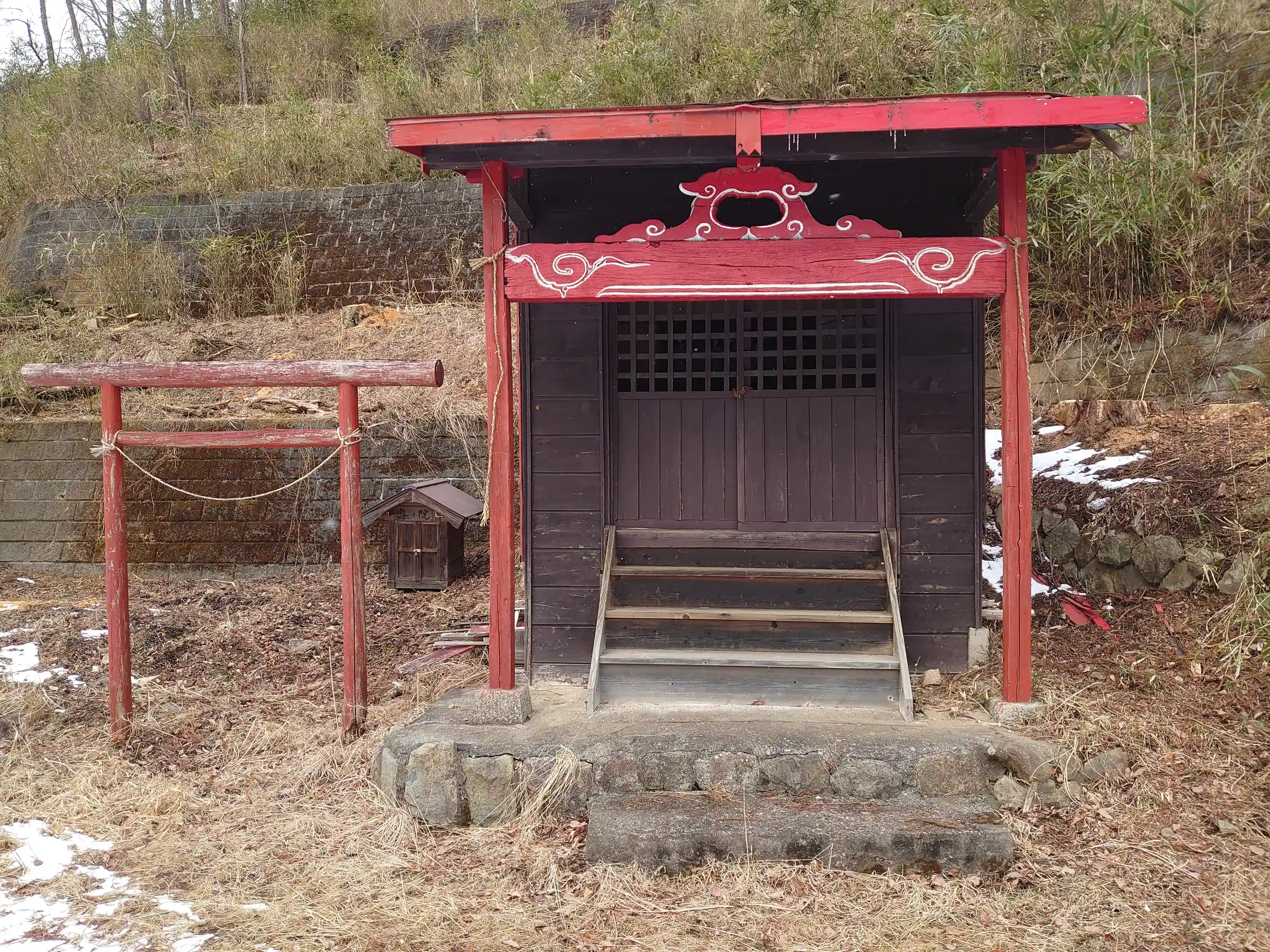 小雪が舞う中、間藤駅から徒歩10分ほどのところに鎮座する、小さなお社です。