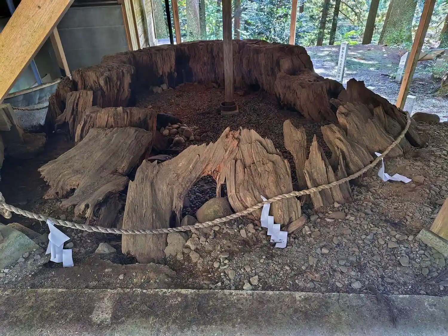 拝殿横に神代杉の切り株があります。