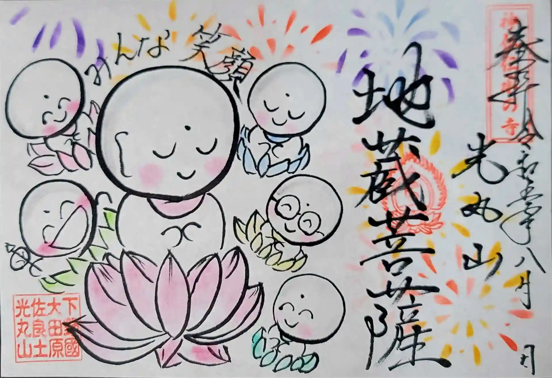 様々な色の花火と色んな顔をなさったお地蔵さまを皆様の御朱印帳にお届け致します🌼