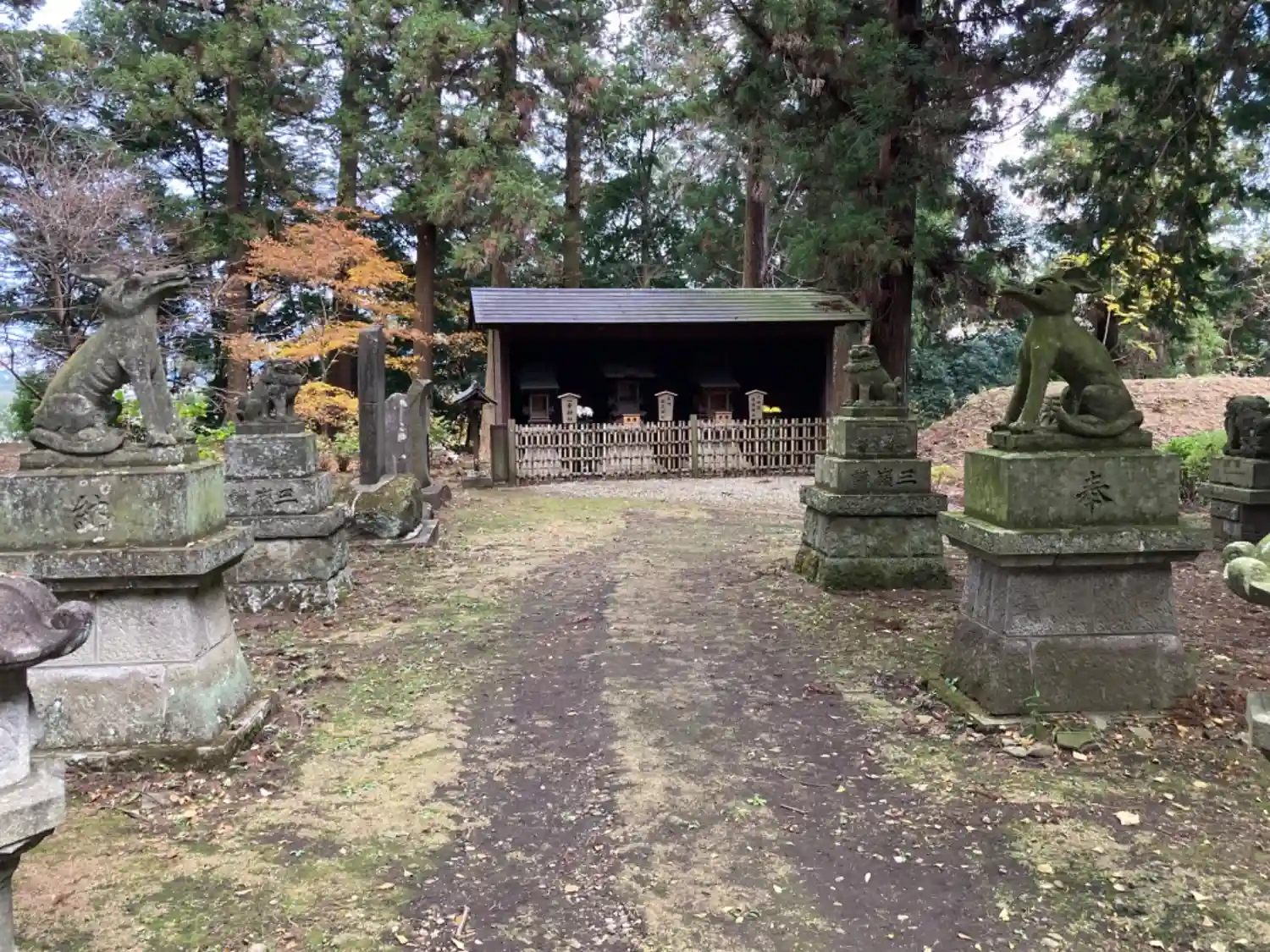 鳥居のように置かれた石や狛犬があります。