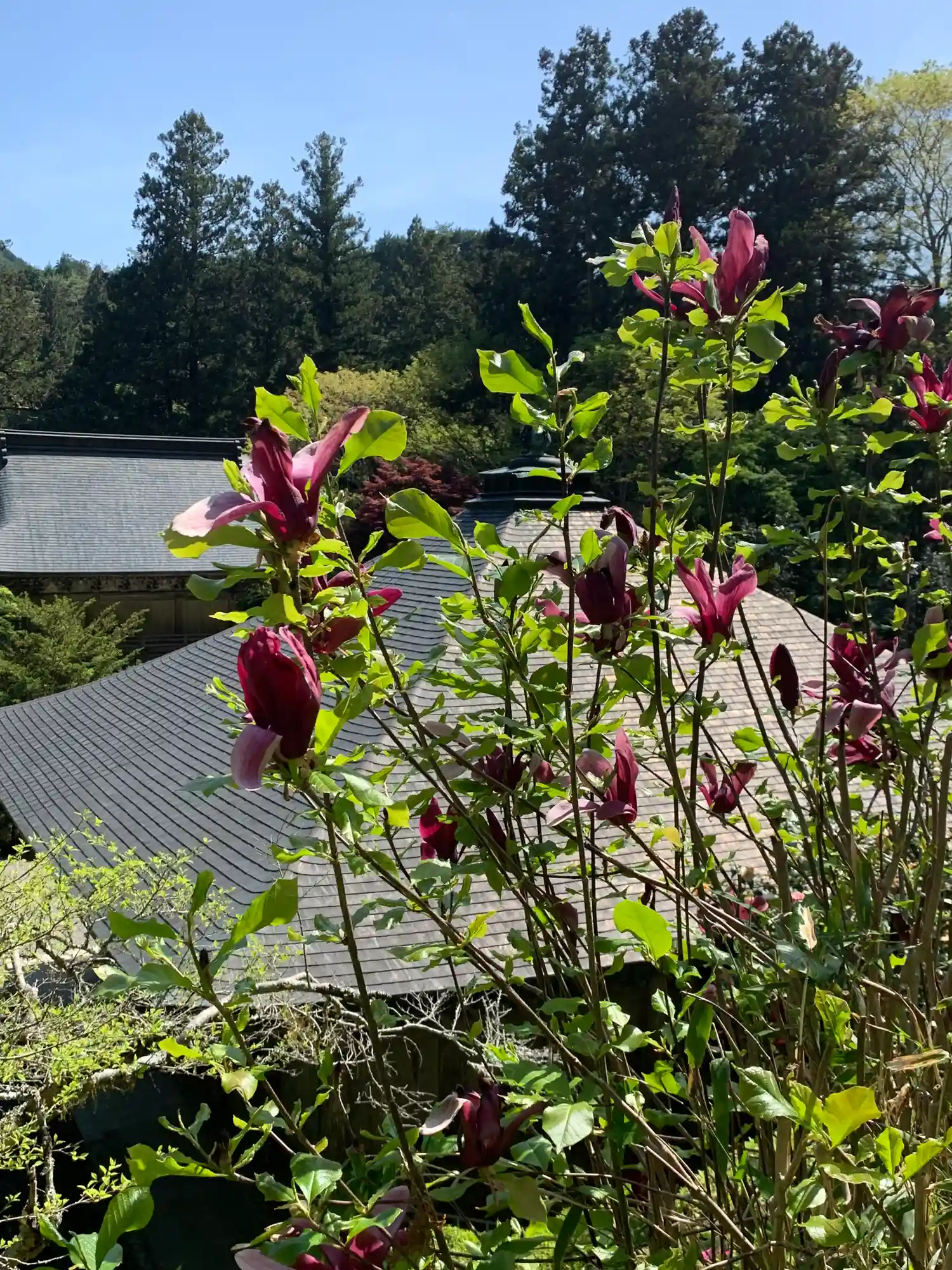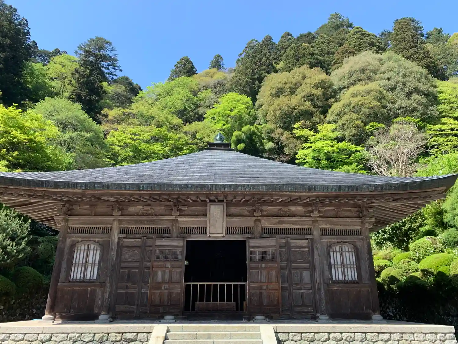緑が美しい。木造の建物が新緑と春の花の中に佇んでいる。