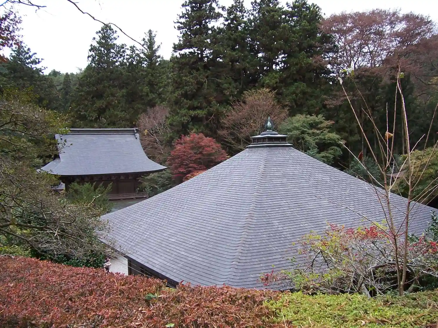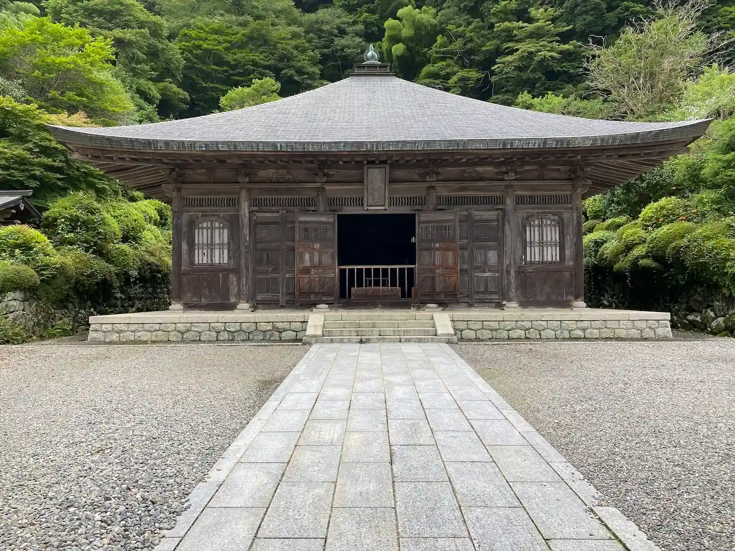 仏殿(釈迦堂)と山門を望む。
