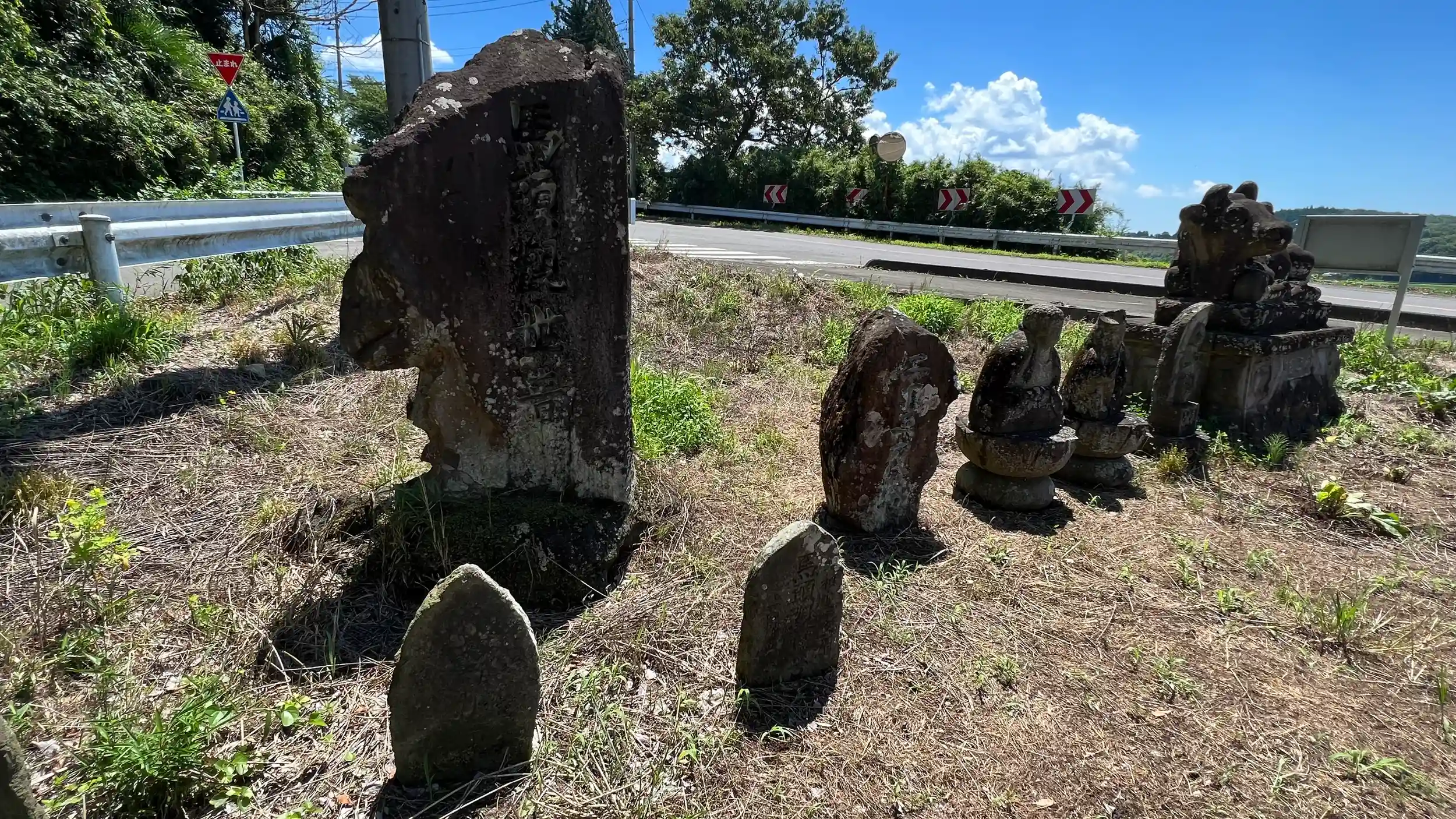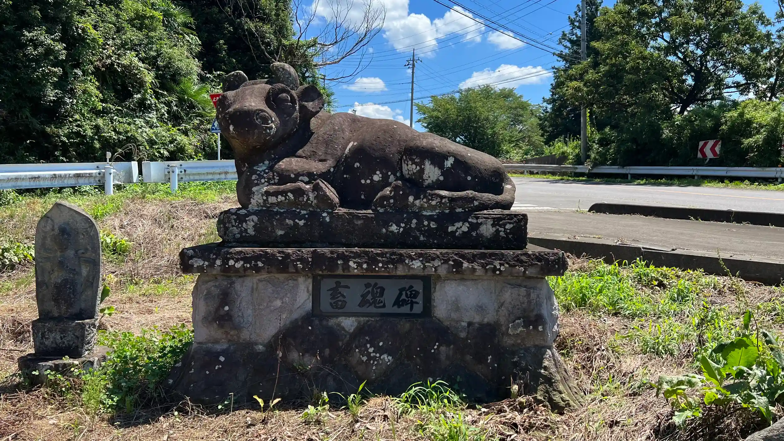 公民館東側に、畜魂碑や観音像や馬頭観音碑とか地蔵とか色々石像が並ぶ。