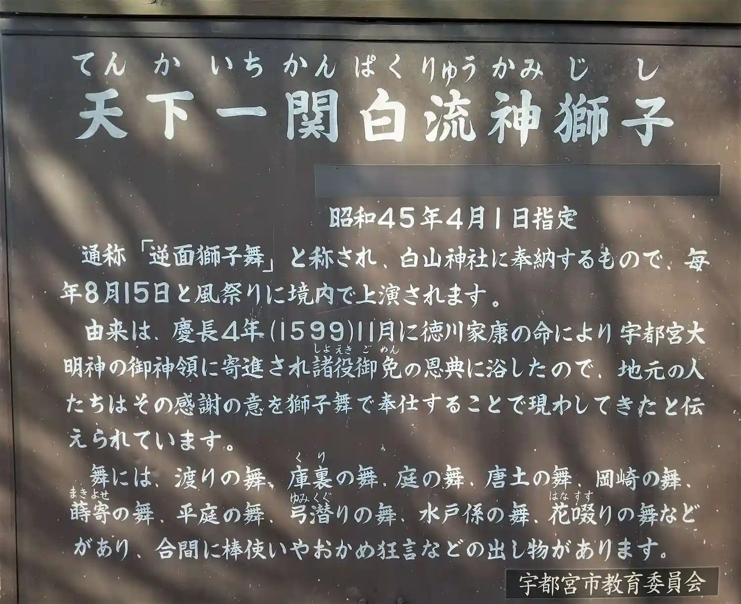 獅子舞の一種が伝統としてあるらしい。400年以上つづく「天下一関白流神獅子」が催されているとのこと。