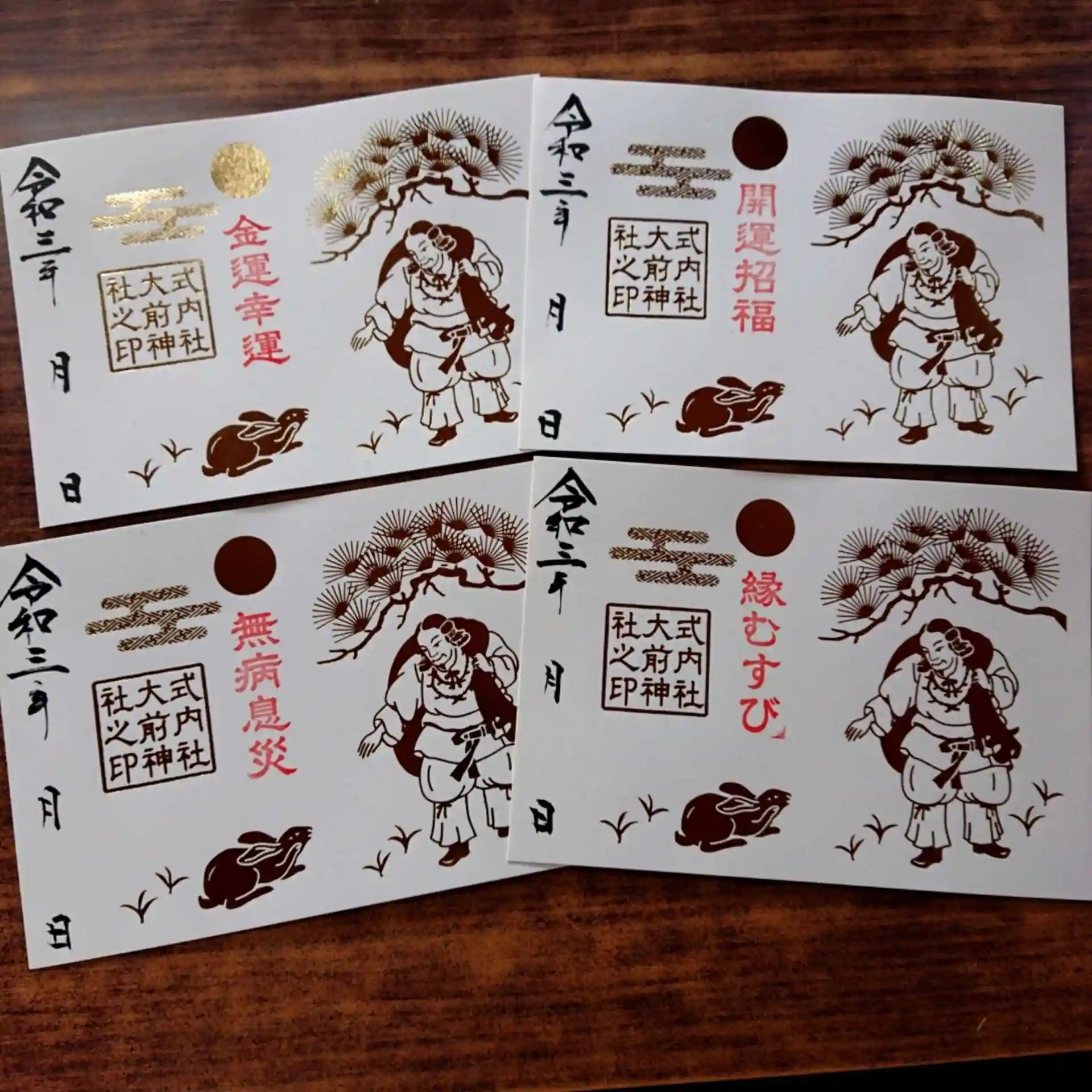 毎月十日と第三日曜日に頒布しておりますだいこく様とうさぎ柄箔押し御朱印です。ご祭神「大国さま」がうさぎに優しく手を差し伸べるデザインです。