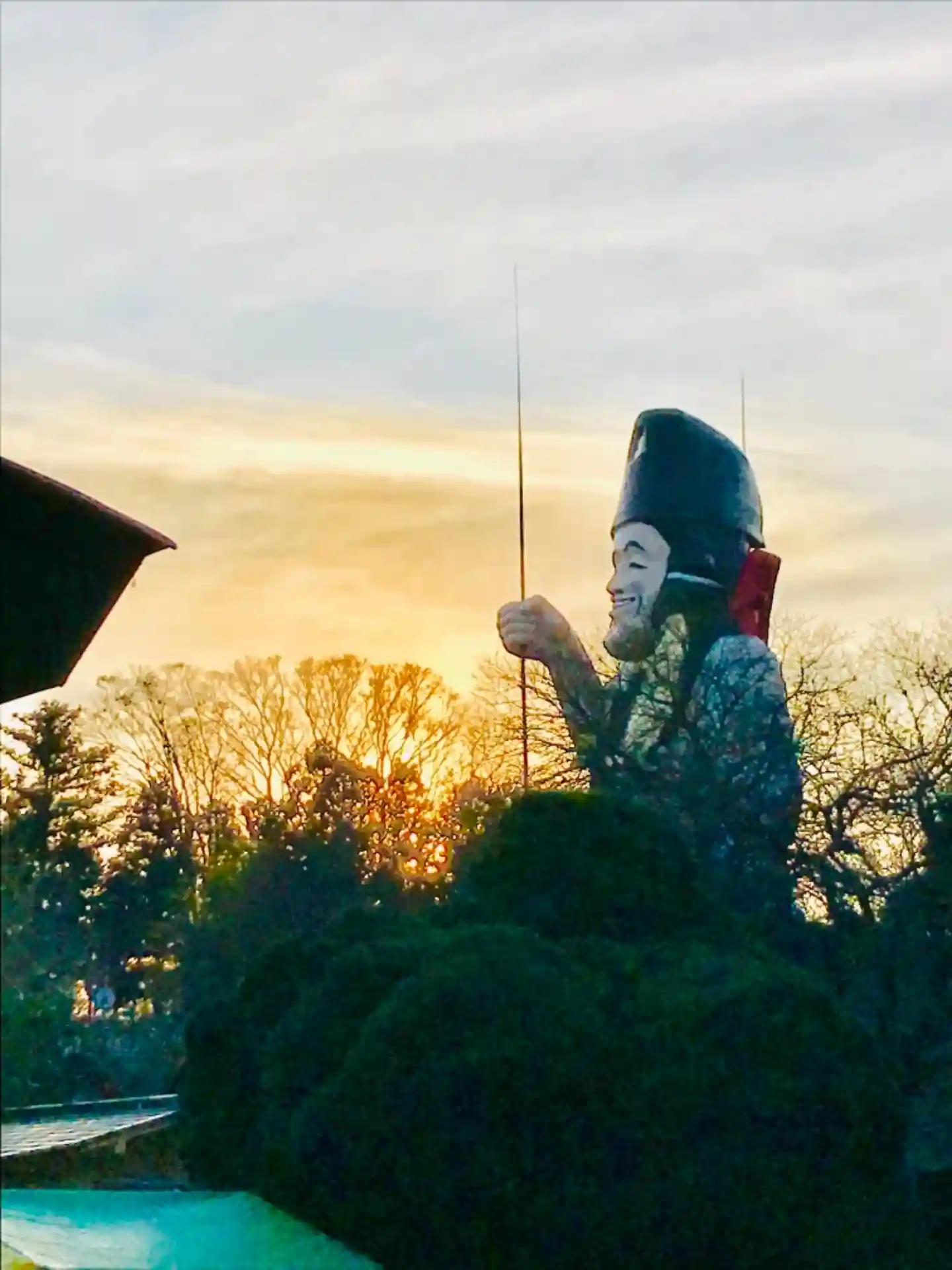 大きな恵比寿様の像が屋根に建つ大前神社。