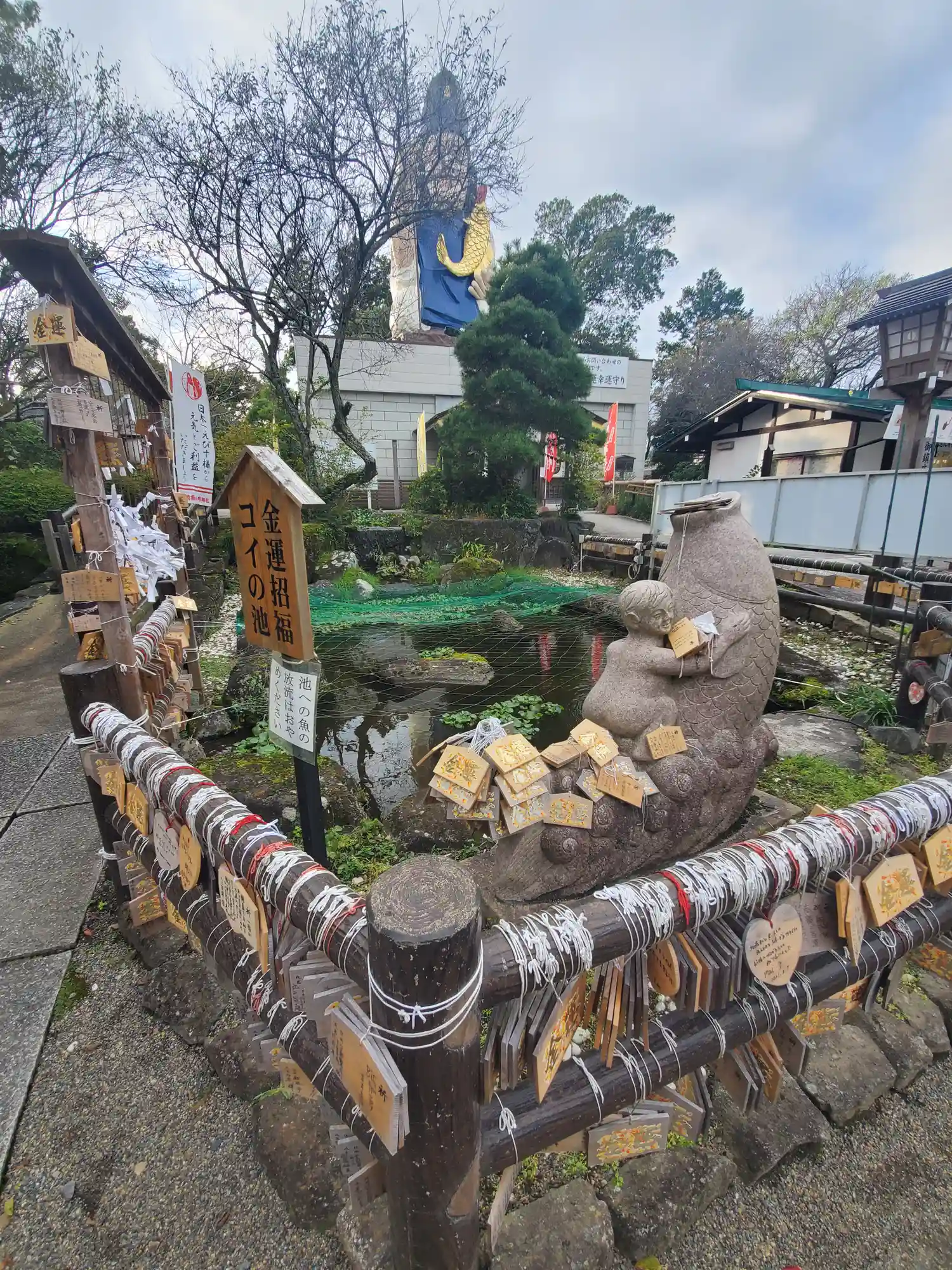 こちらの恵比寿像は当神社で神様の使いとされる鯉を鯛の代…