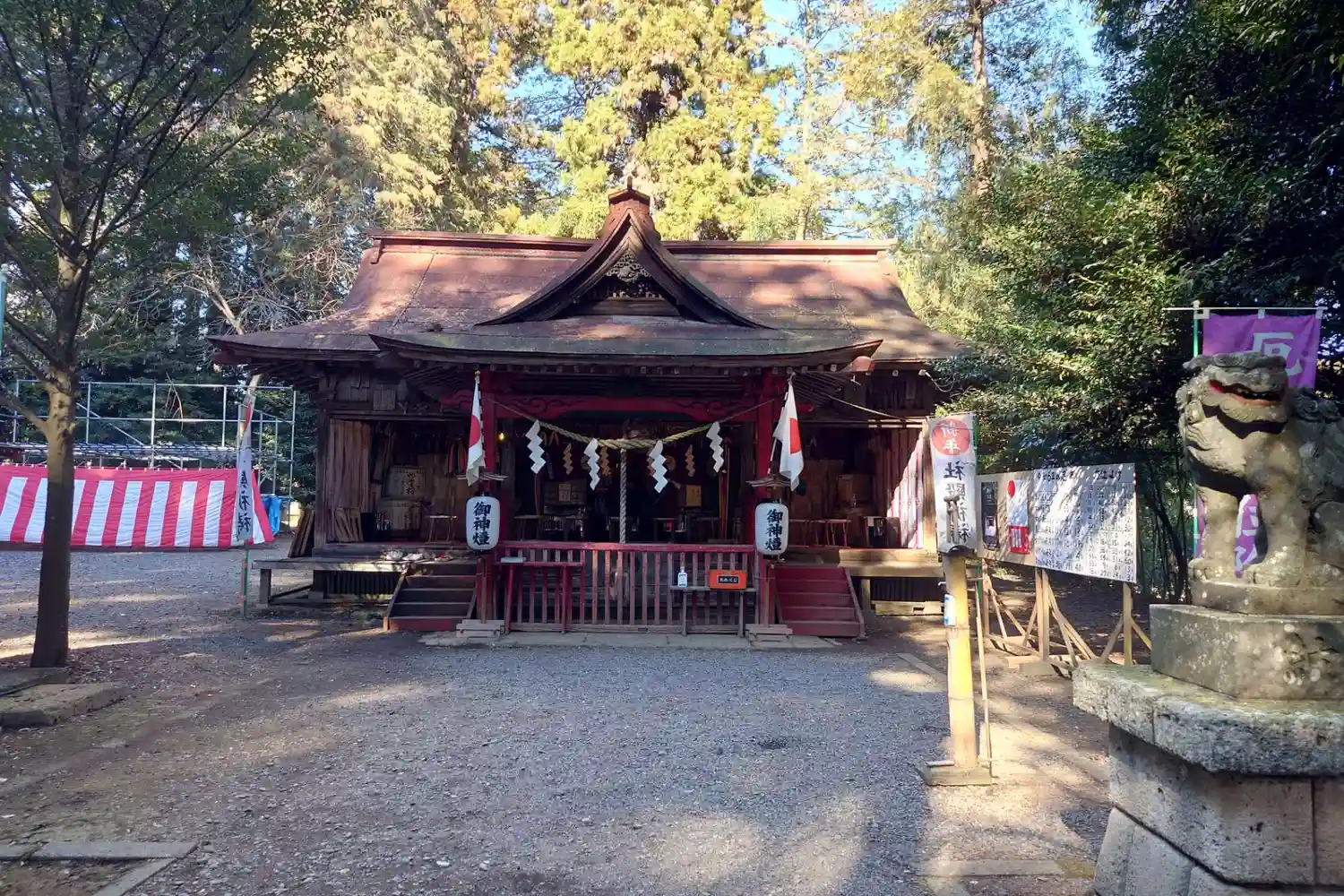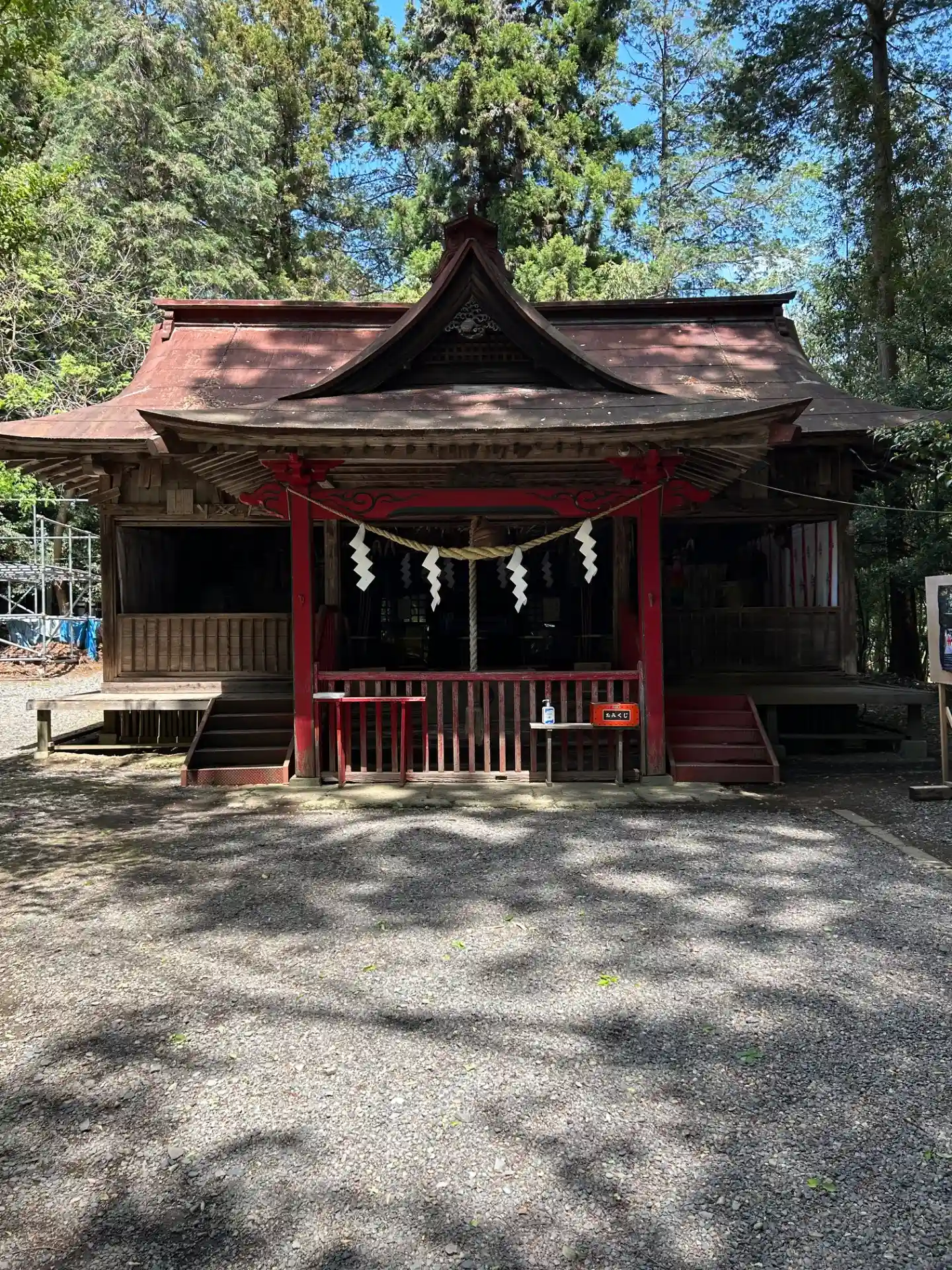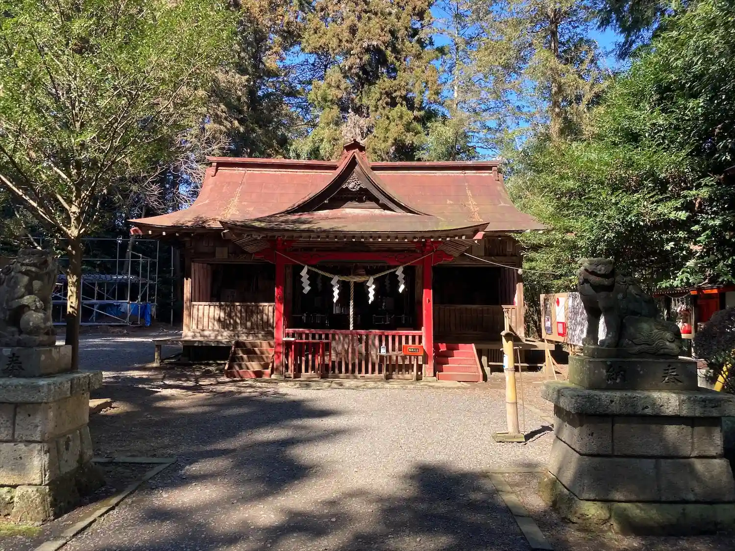 右は神楽殿かなにかを修築中らしく仮設足場