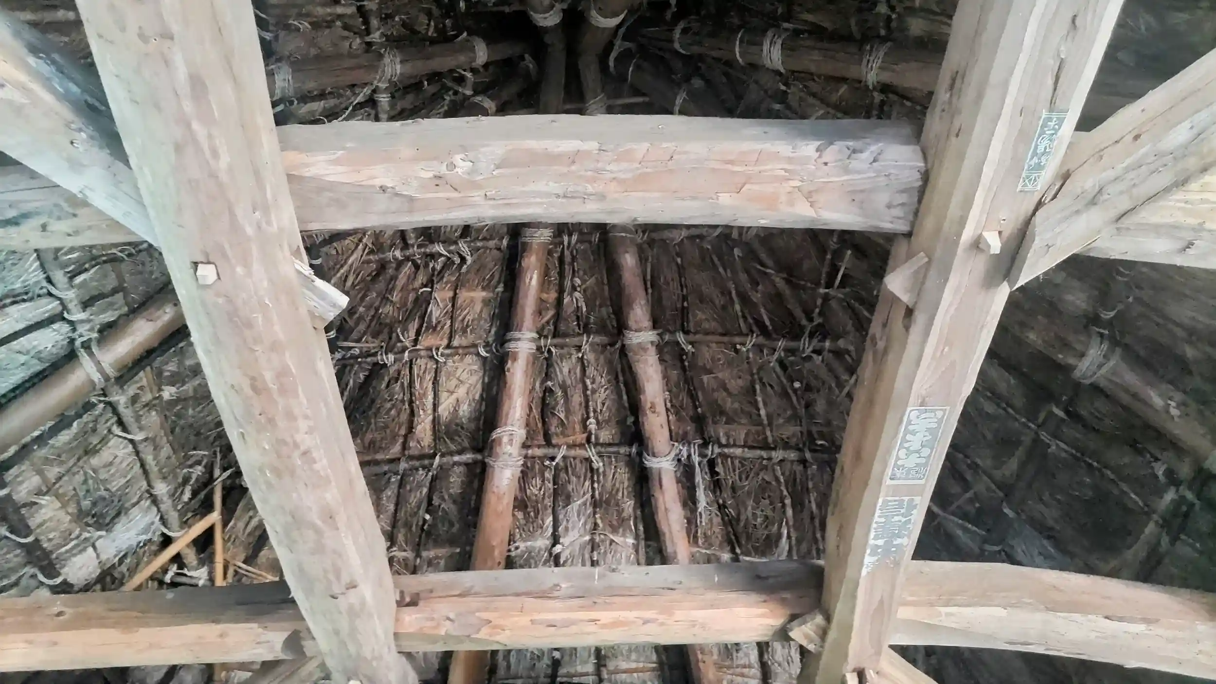 伊門神社を覆う建物を中から見上げた様子