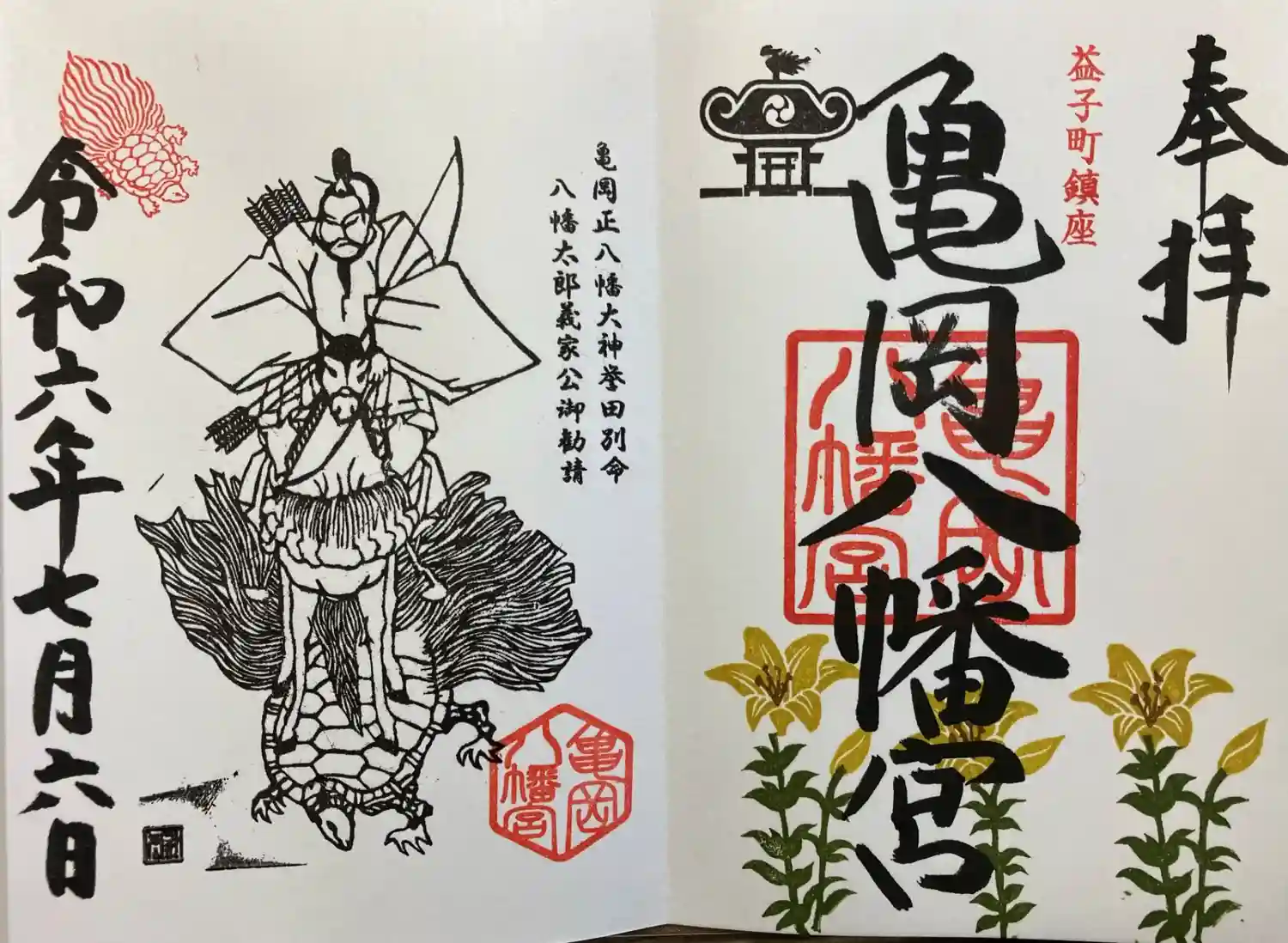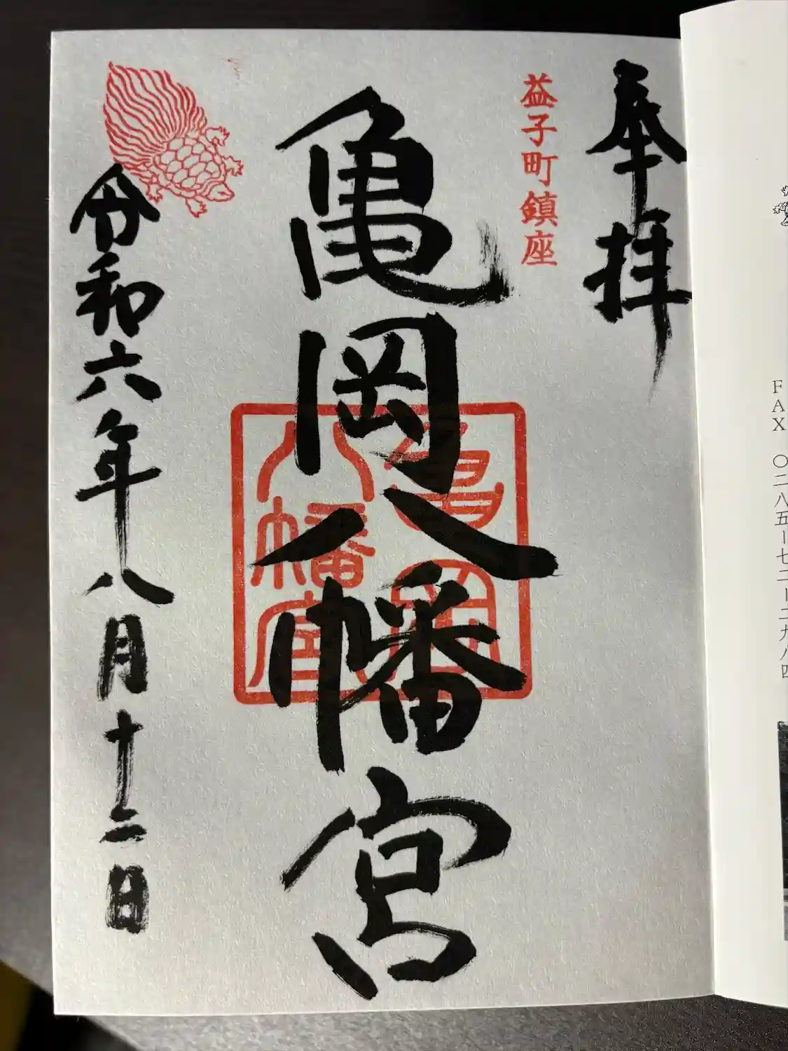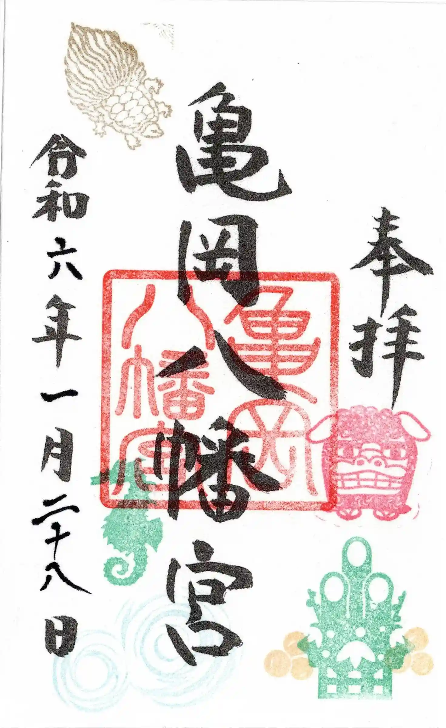 甲羅の横と裏に亀岡八幡宮の印が押されてます。