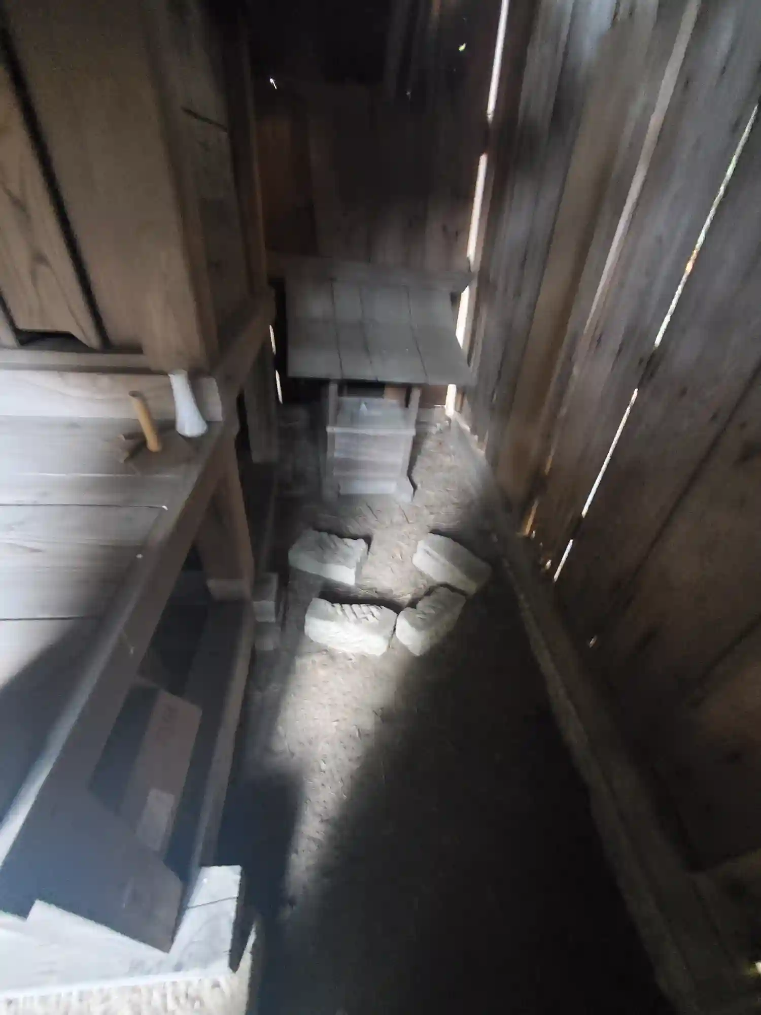 伊門神社を覆う建物を中から見上げた様子
