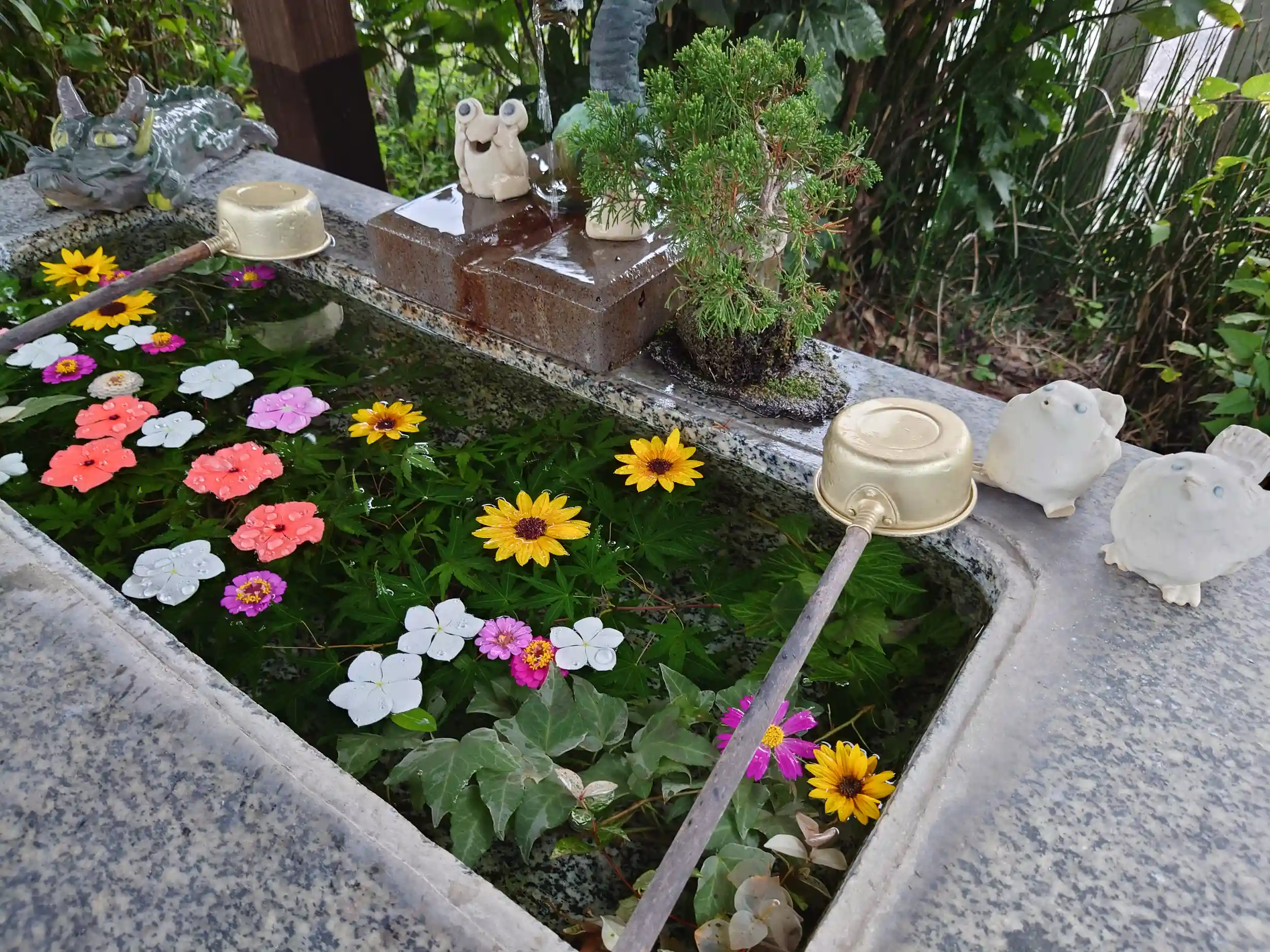 花手水です。カエル🐸の置き物もあります。