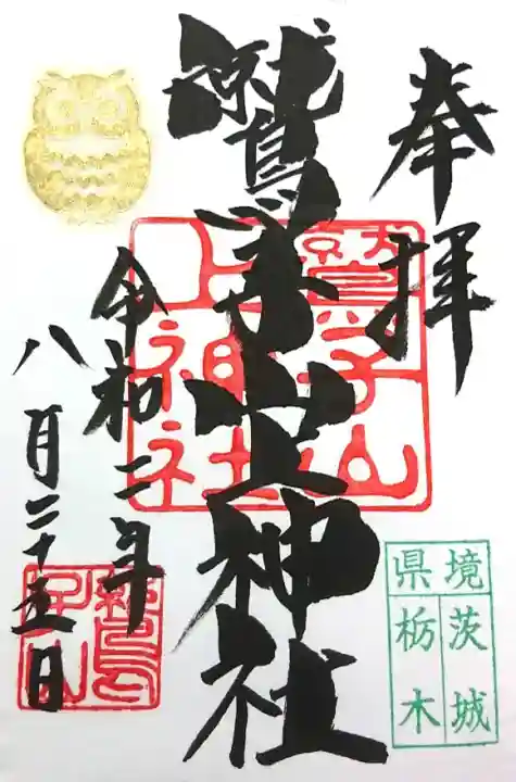| 御朱印 | あり 真ん中に鷲子上山神社と書かれ、社印、右下に県境茨城栃木、左上にフクロウの印が押された御朱印です。