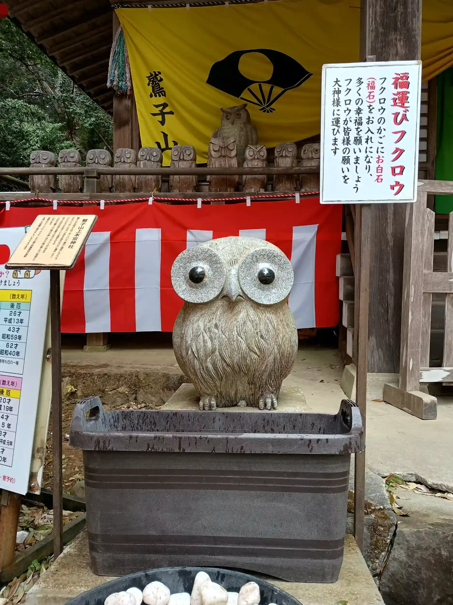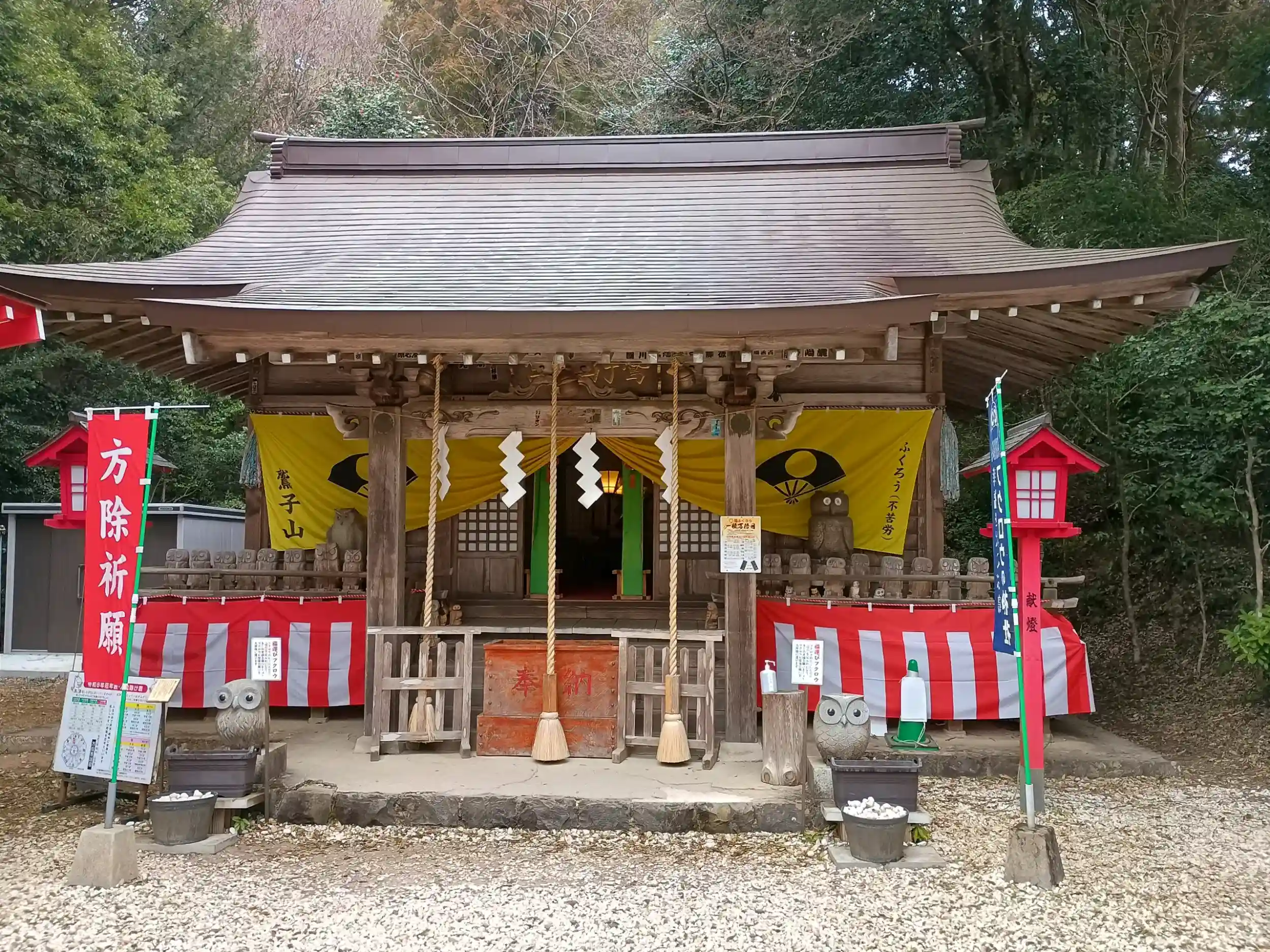 茨城県常陸大宮市と栃木県那珂川町の鷲子山上(とりのこさんしょう)神社⛩️大鳥居・隋神門の真ん中が茨城県と栃木県の県境になっています。社務所も茨城県と栃木県それぞれにあります。境内には地上7メートルの金色の大フクロウ像が鎮座しており、フクロウ(不苦労)の神社として有名です。フクロウをモチーフとした御朱印、御守など見ているだけでも楽しめます。金運、運気上昇、厄除けなどのご利益があります。大自然豊かな山奥の中にあり、とても気持ち良くお詣りすることができました。、