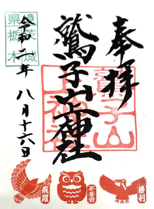 真ん中に鷲子山上神社と書かれ、左上に「県境 茨城 栃木」の印、真ん中に鷲子山上神社の印、下部に「勝利の八咫烏、不苦労のふくろう、飛躍の鷲」の印が押されています。