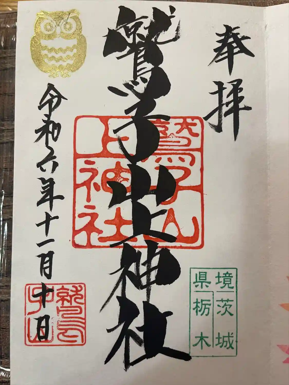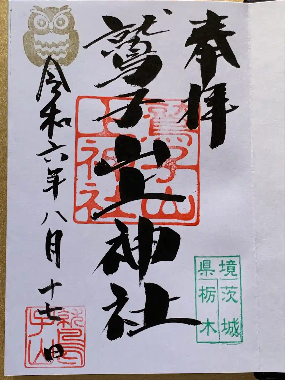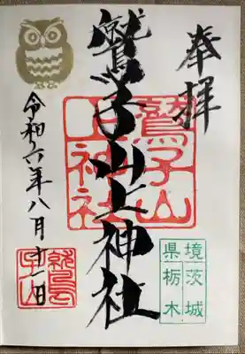 真ん中に鷲子山上神社と書かれ、右下に「県境 茨城 栃木」の印、真ん中に鷲子山上神社の印、左上に金色のふくろうの印、左下に鷲子山の印が押されています。