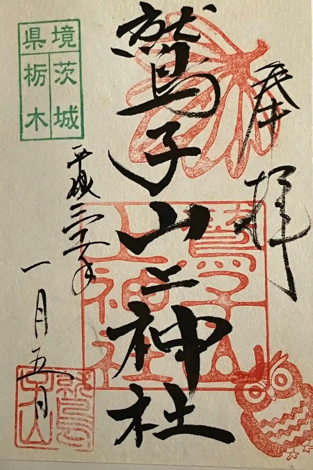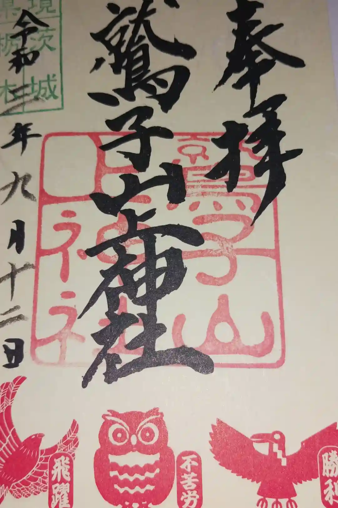 真ん中に鷲子山上神社と書かれ、左上に「県境 茨城 栃木」の印、真ん中に鷲子山上神社の印、下部に「勝利の八咫烏、不苦労のふくろう、飛躍の鷲」の印が押されています。