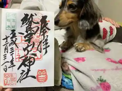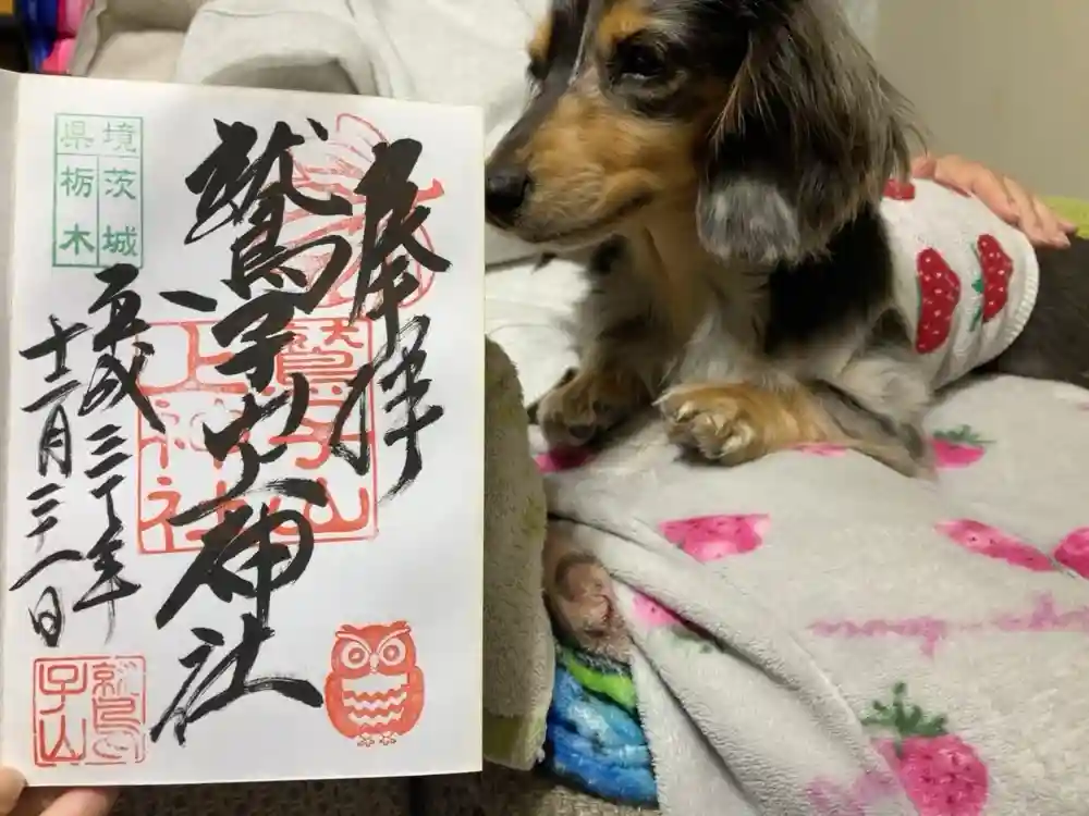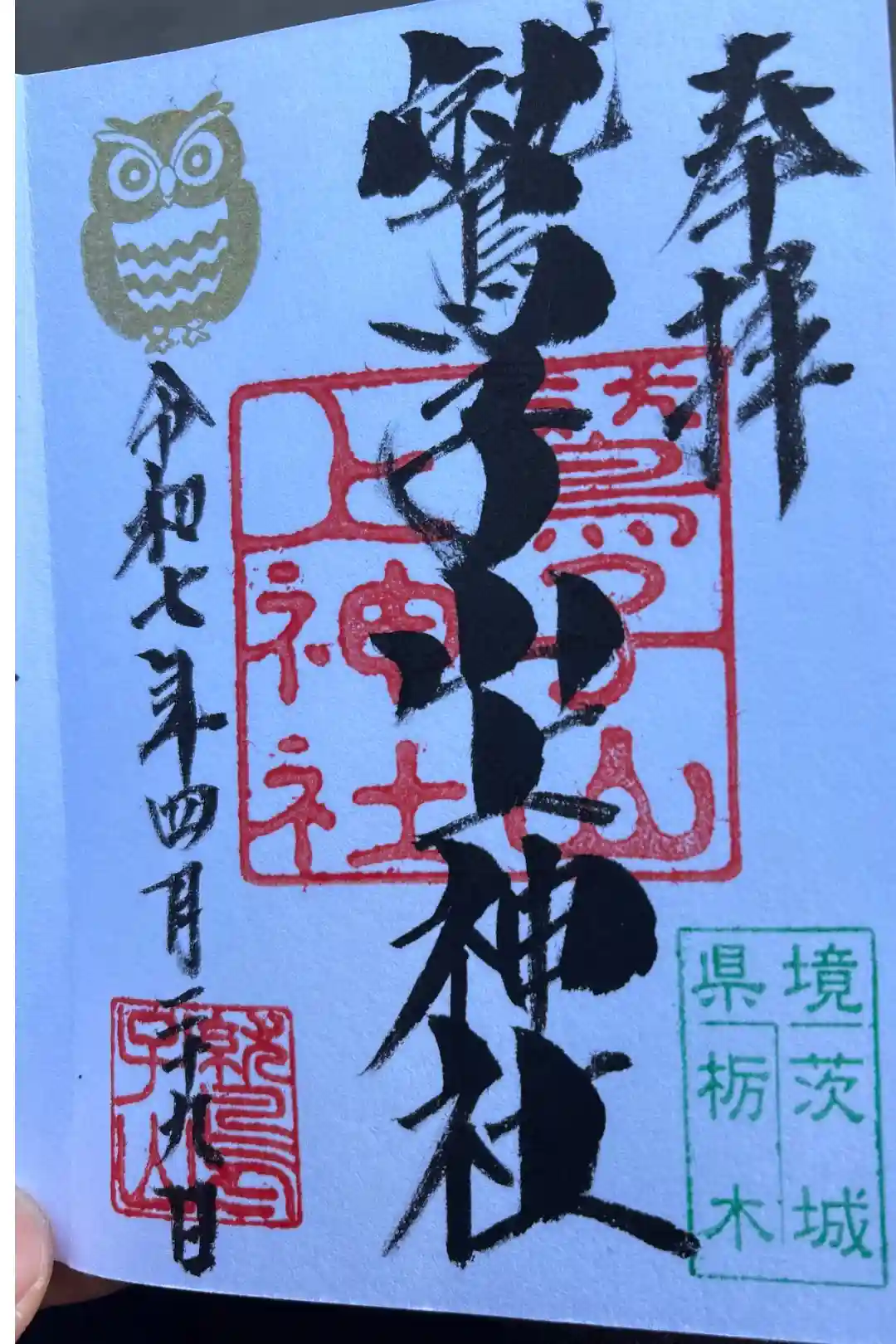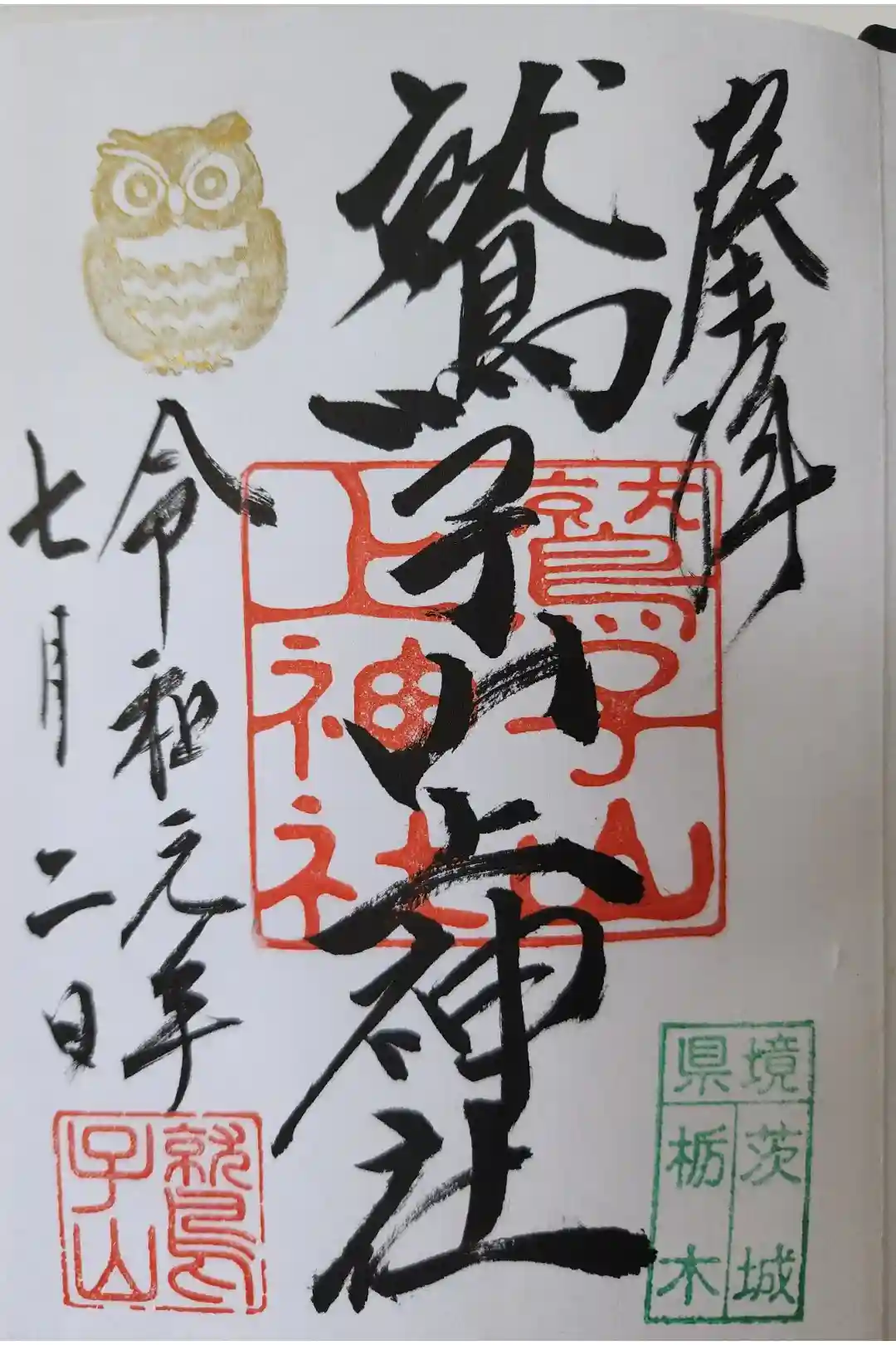 真ん中に鷲子上山神社と書かれ、社印、右下に県境茨城栃木、左上にフクロウの印が押された御朱印です。