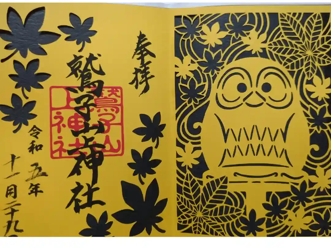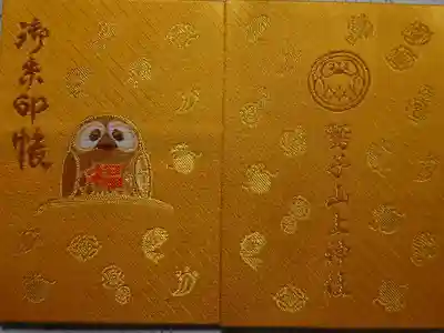 黄色の地に縁起物が散りばめられた御朱印帳で、表面は真ん中に大フクロウ(不苦労)像がデザインされ、左上に御朱印帳の文字、裏面はフクロウの意匠と鷲子山上神社の文字が入っています。