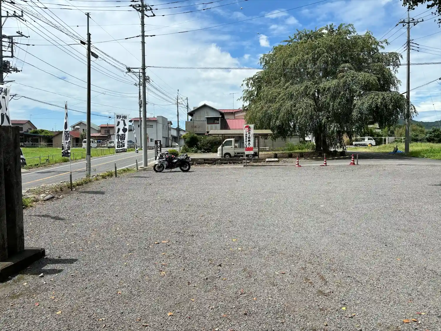 鷲子山上神社からこちらへ。駐車場というより区切りの無いスペースに止めました。道路からのぼりや看板が…