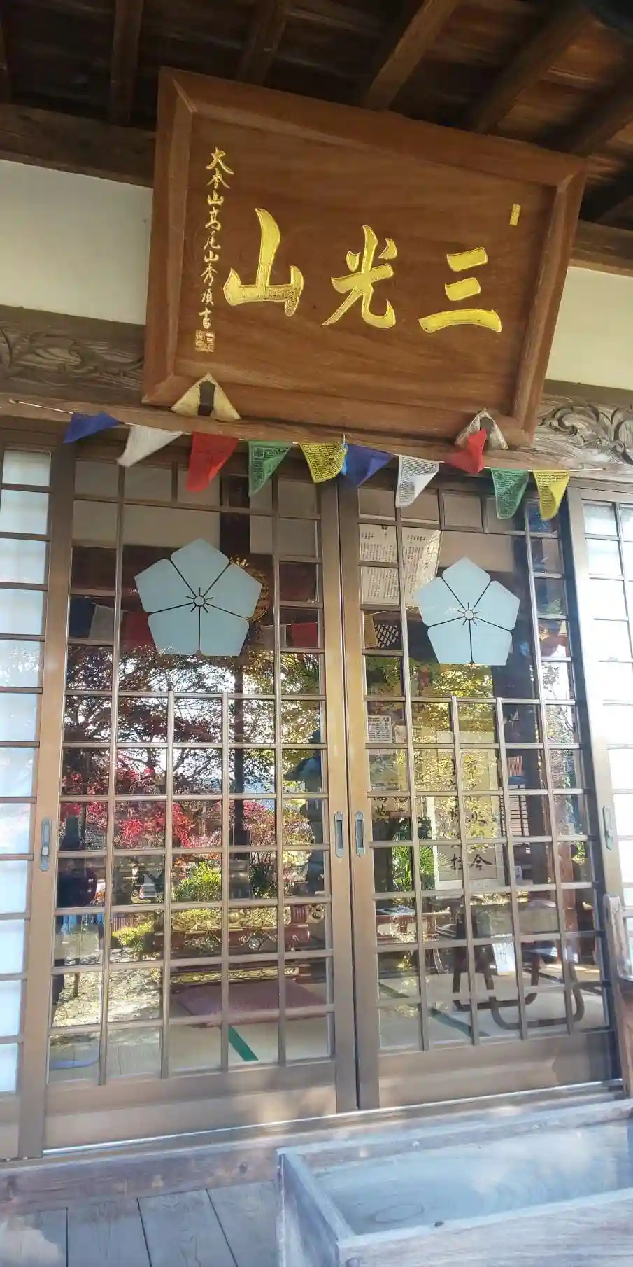 本堂前。お参りをしたら紅葉がガラスに映っていました。