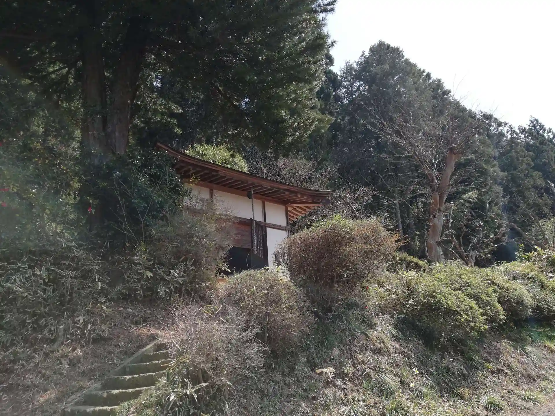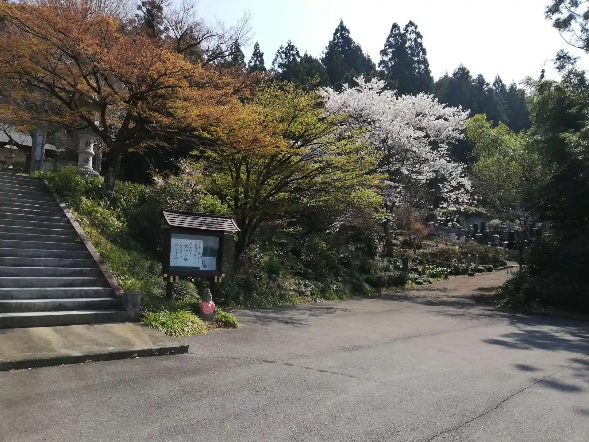 駐車場から薬師堂と墓地を望むと、ソメイヨシノが見頃を迎えていました。