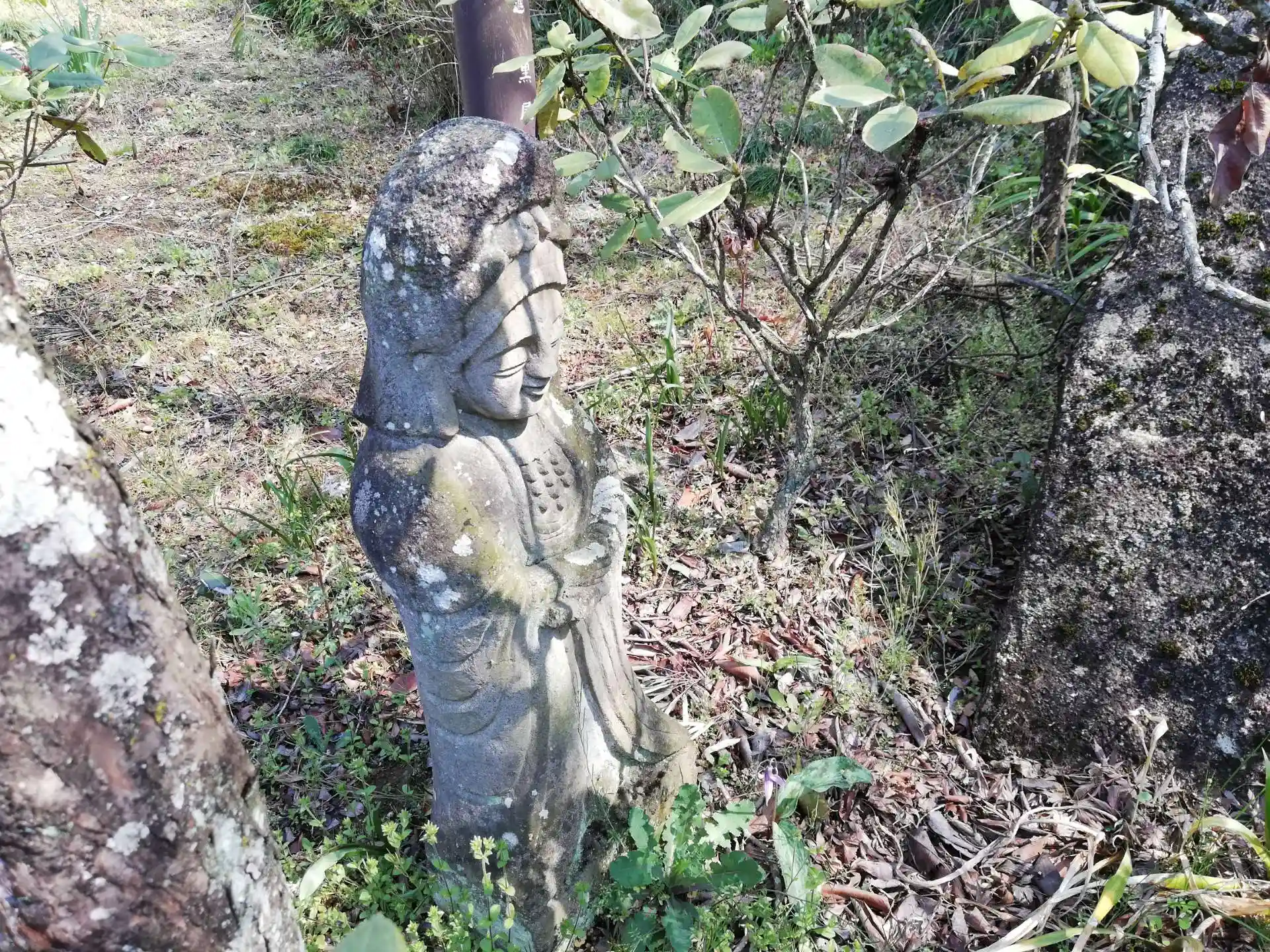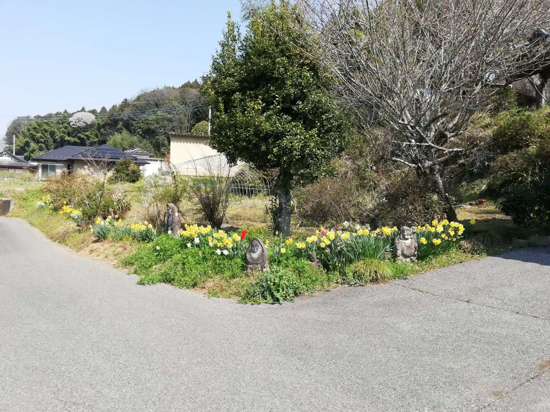 手水舎の手前、花に囲まれた仏像が点在しています。