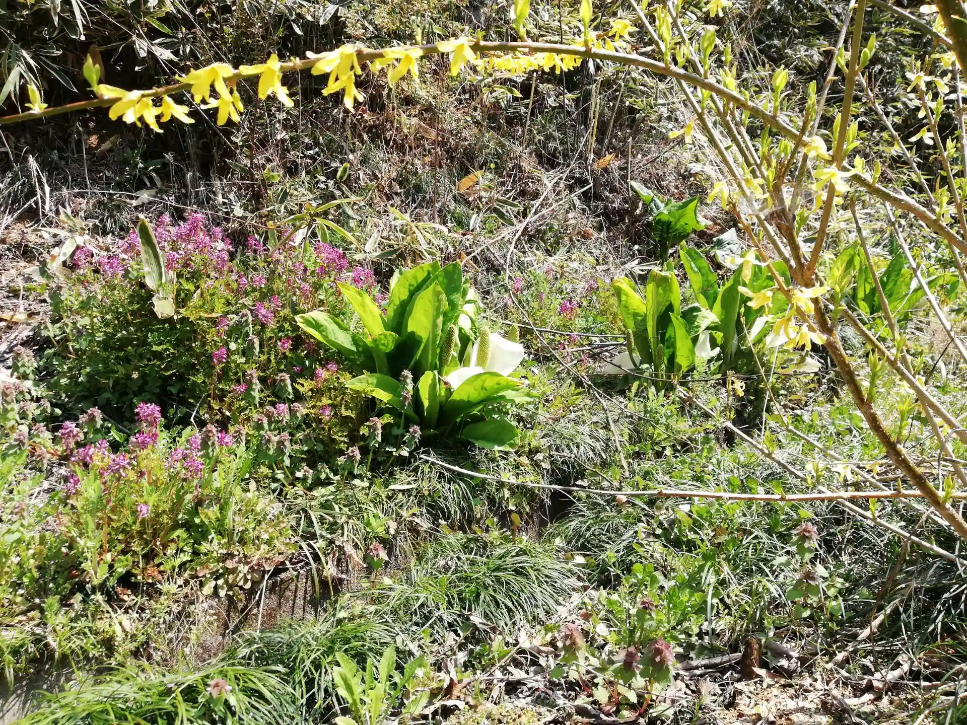 ミズバショウは裏山からの水脈近くにどんどん増えるそうです。
