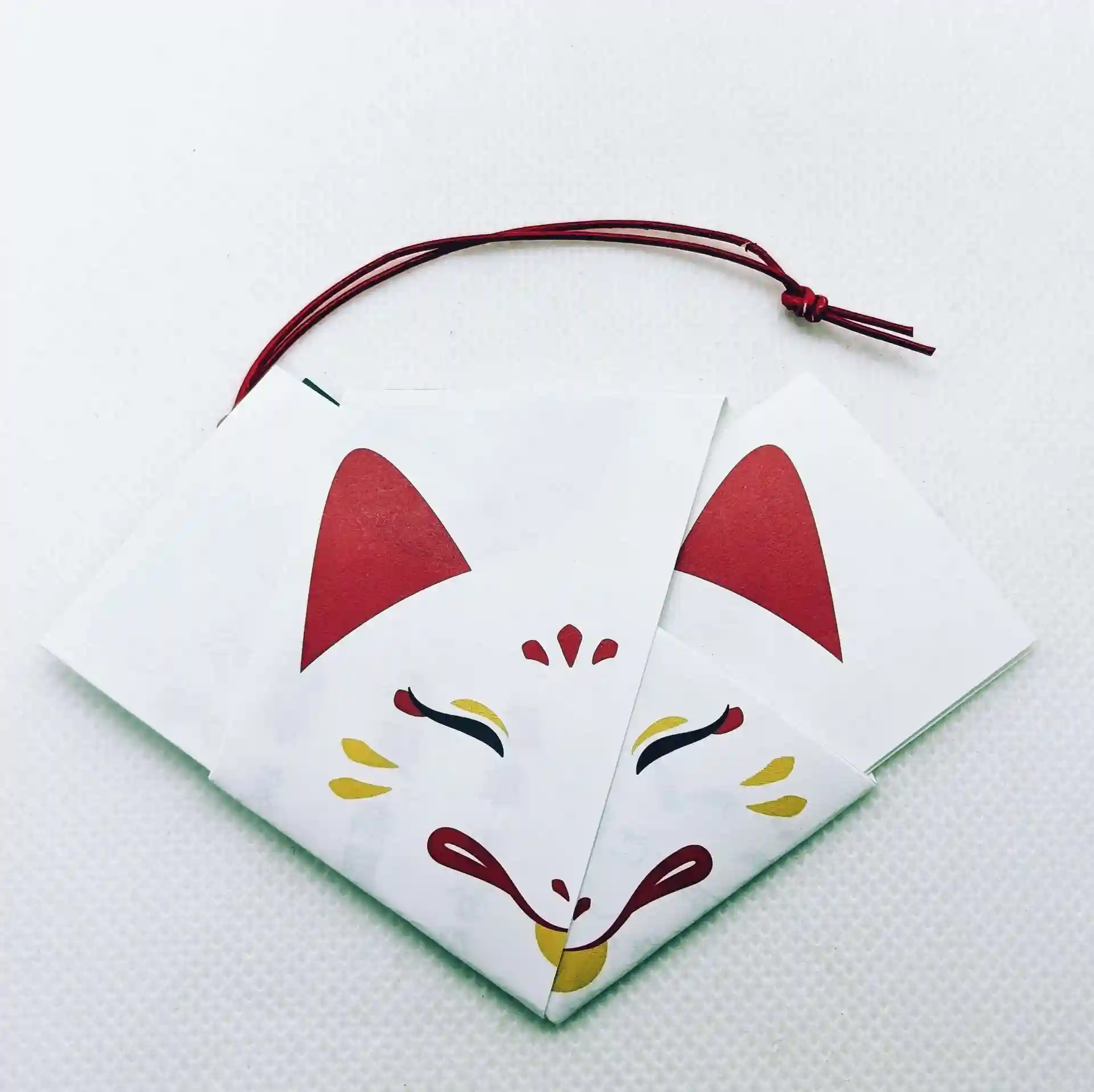 キツネの顔が描かれた折り紙タイプのおみくじは、どこかいたずらっぽくて可愛らしく見ているだけで心が和む顔立ちのキツネです。