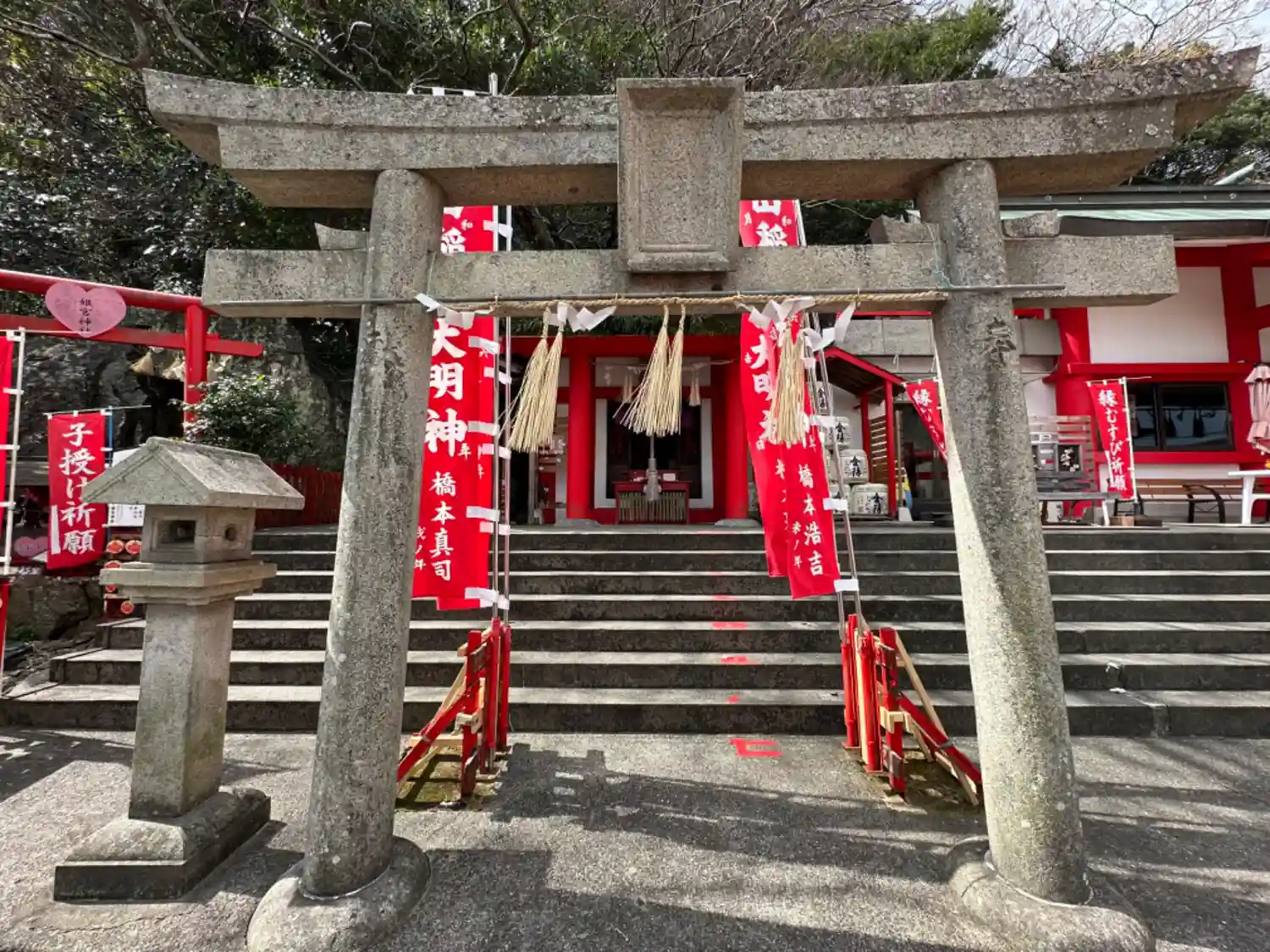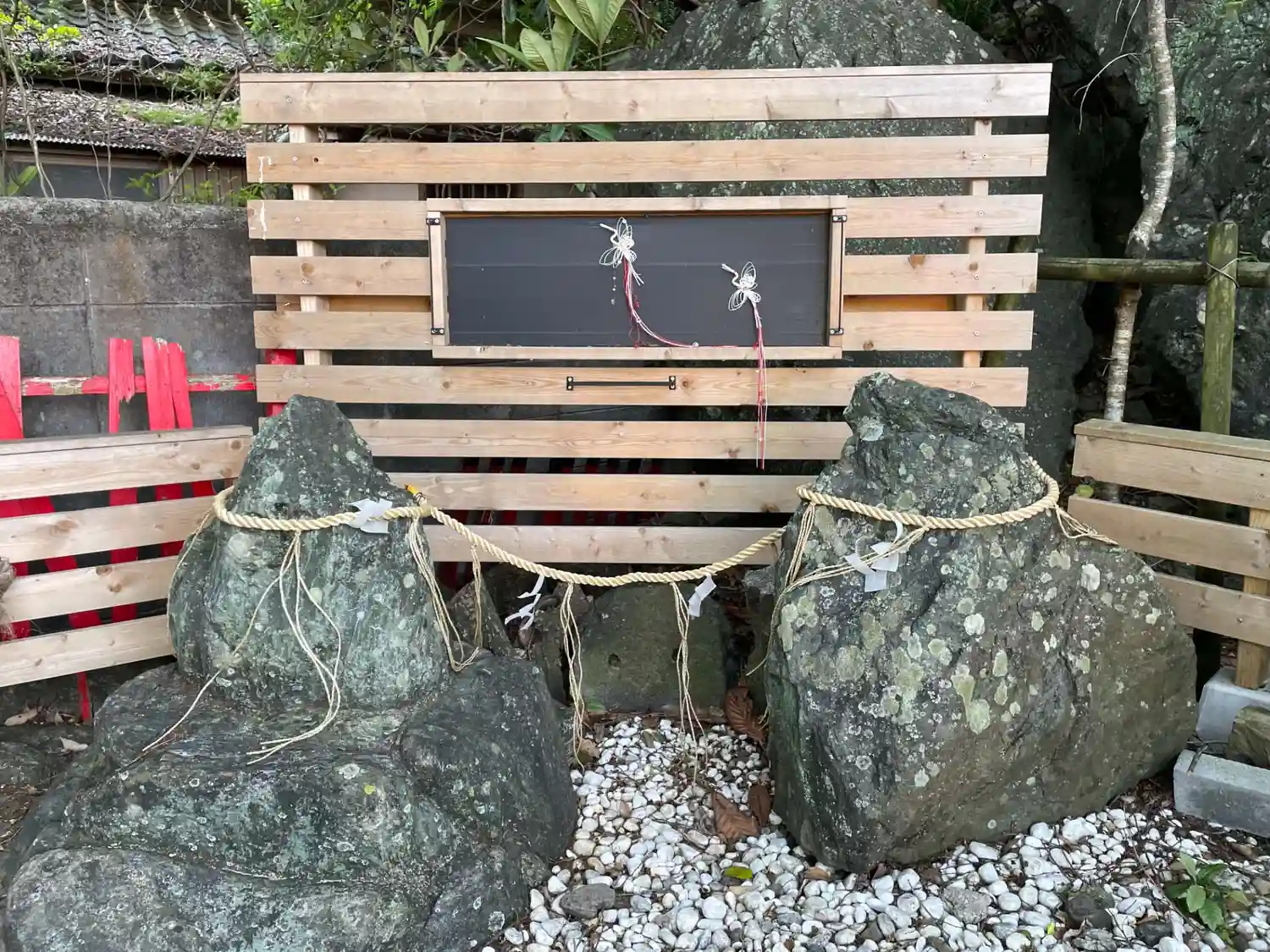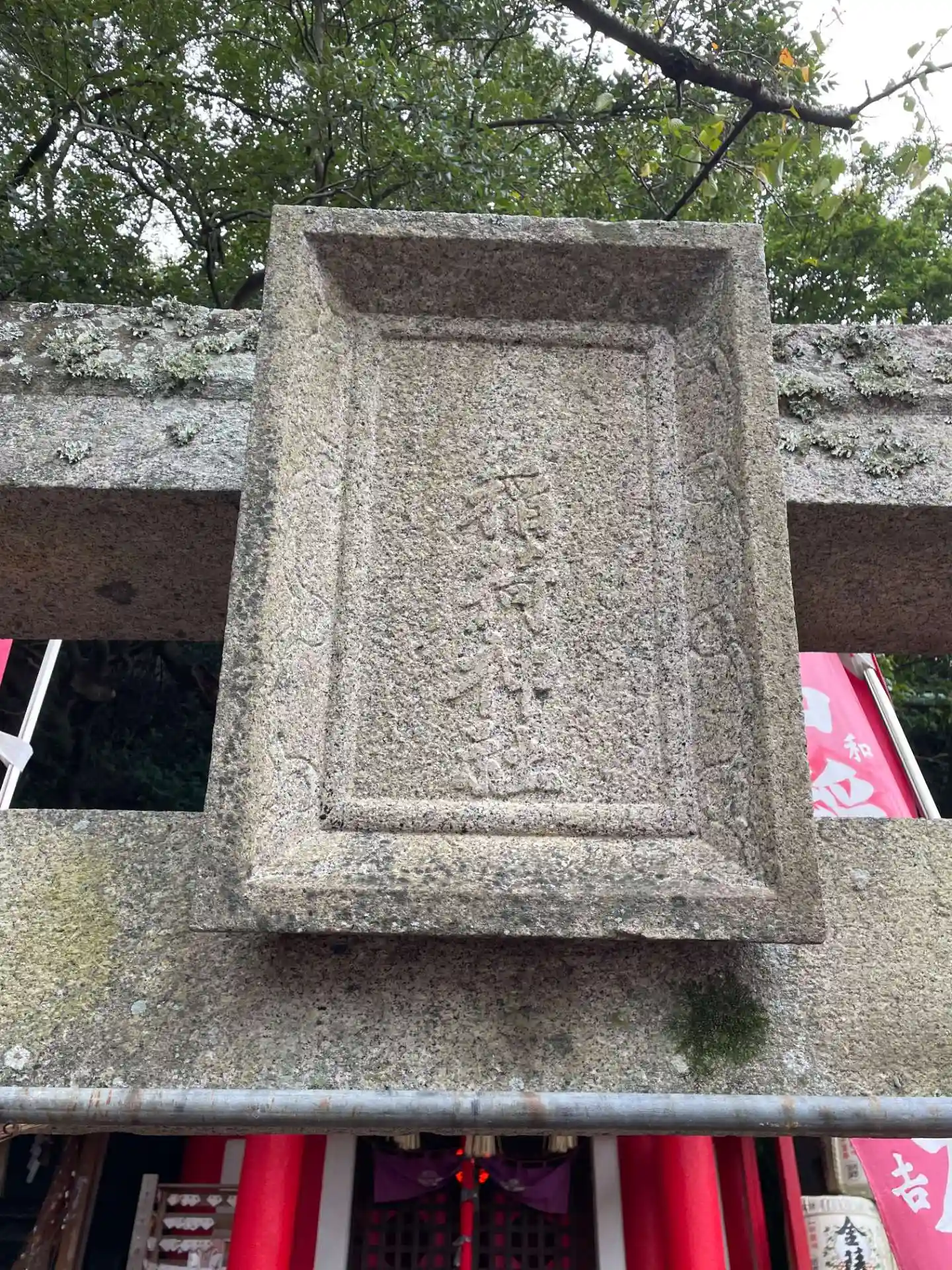 赤い鳥居の下にある禊石