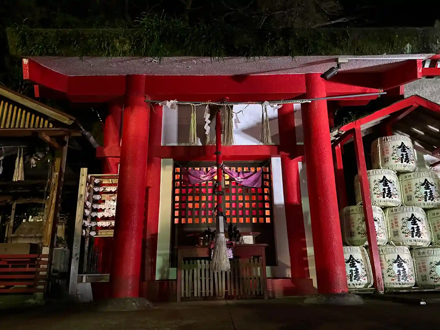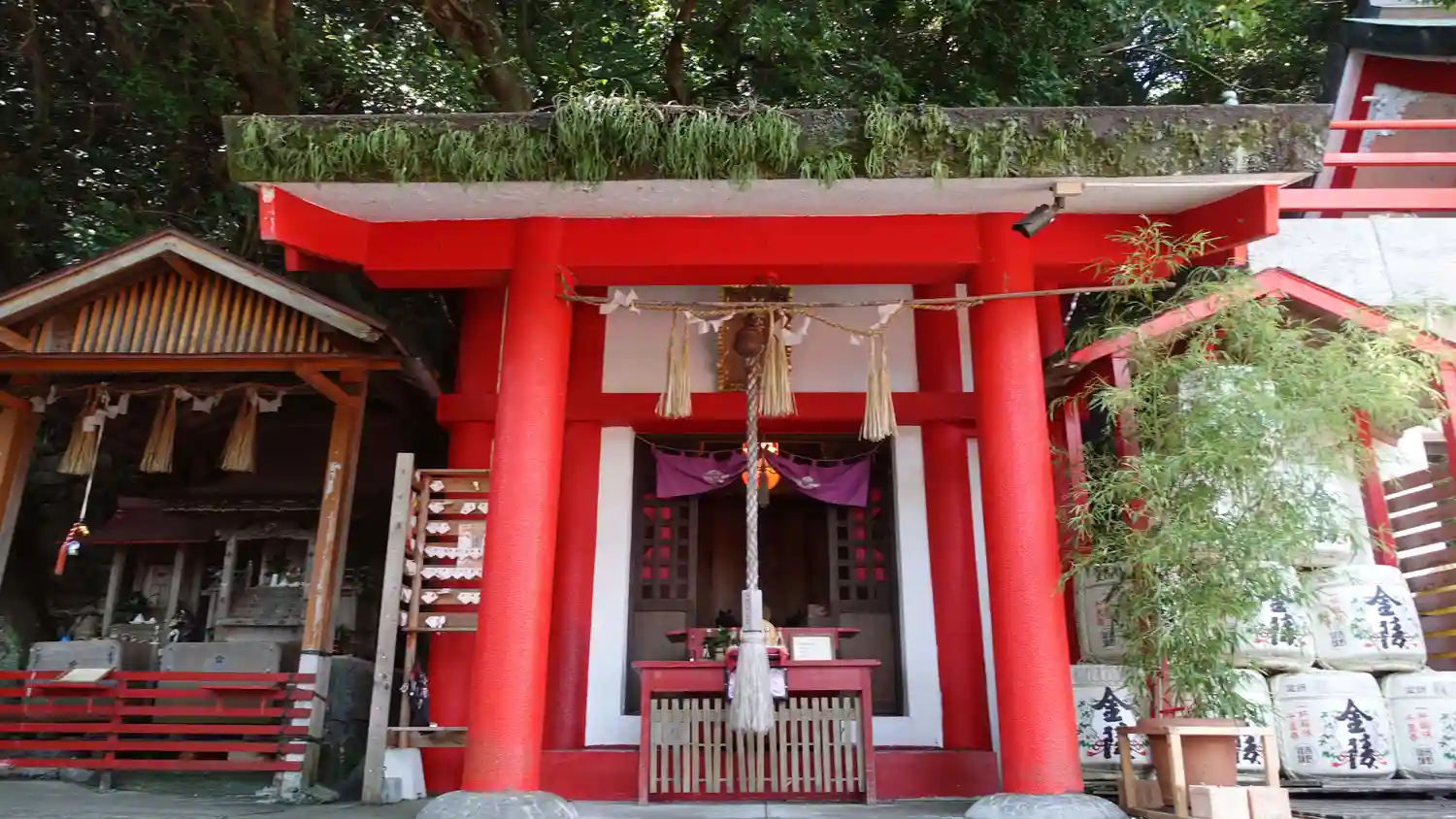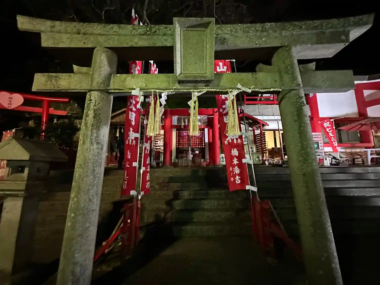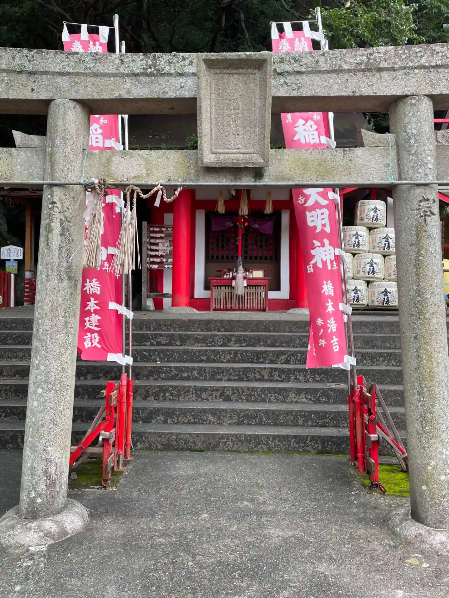 赤い鳥居の下にある禊石