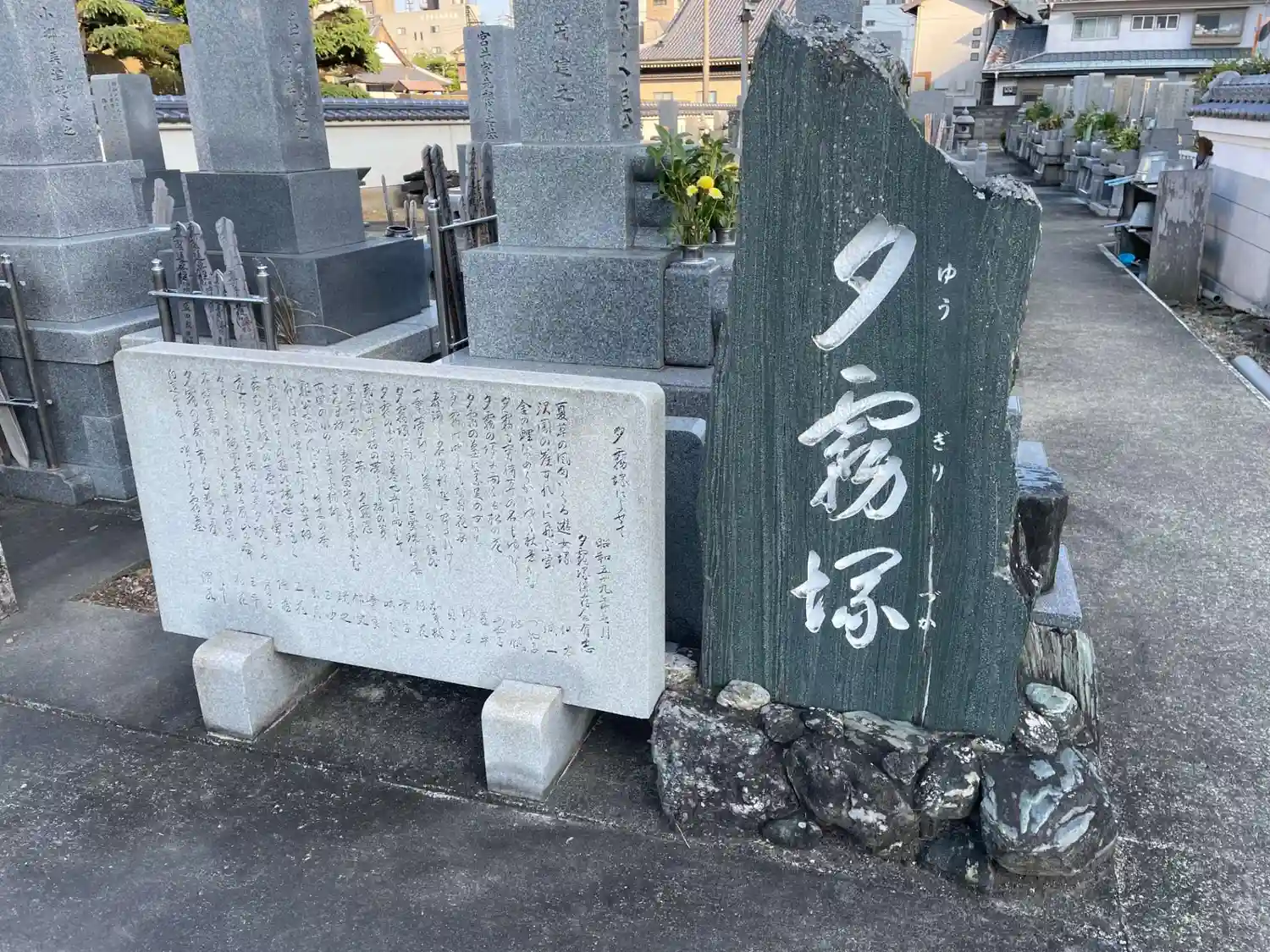 墓所のいちばん手前に碑がありました。その前に古いお墓があり これが夕霧さんのお墓だと思います。