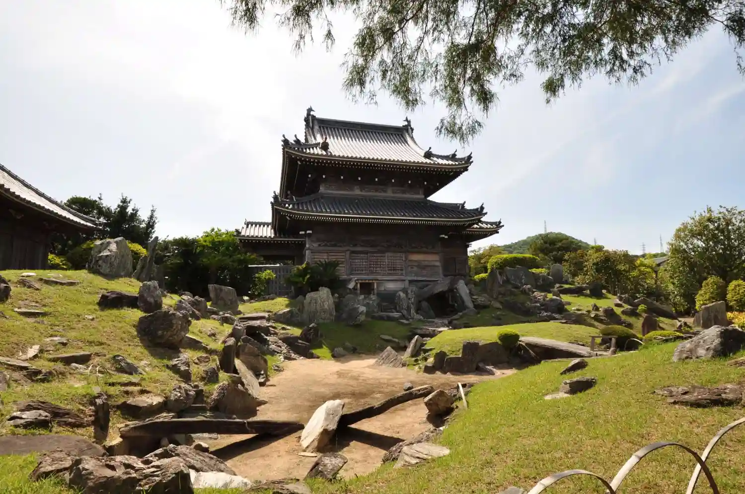 本堂を背景にする庭は、多くの巨岩や枯池が配置された築山式枯山水。安土・桃山時代に作られたと考えられている。(四国霊場開創1200年記念絵はがき)
