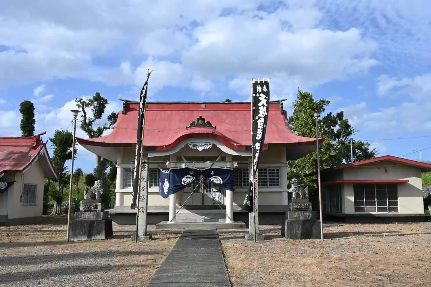 赤い屋根の変わった形の神社です。
