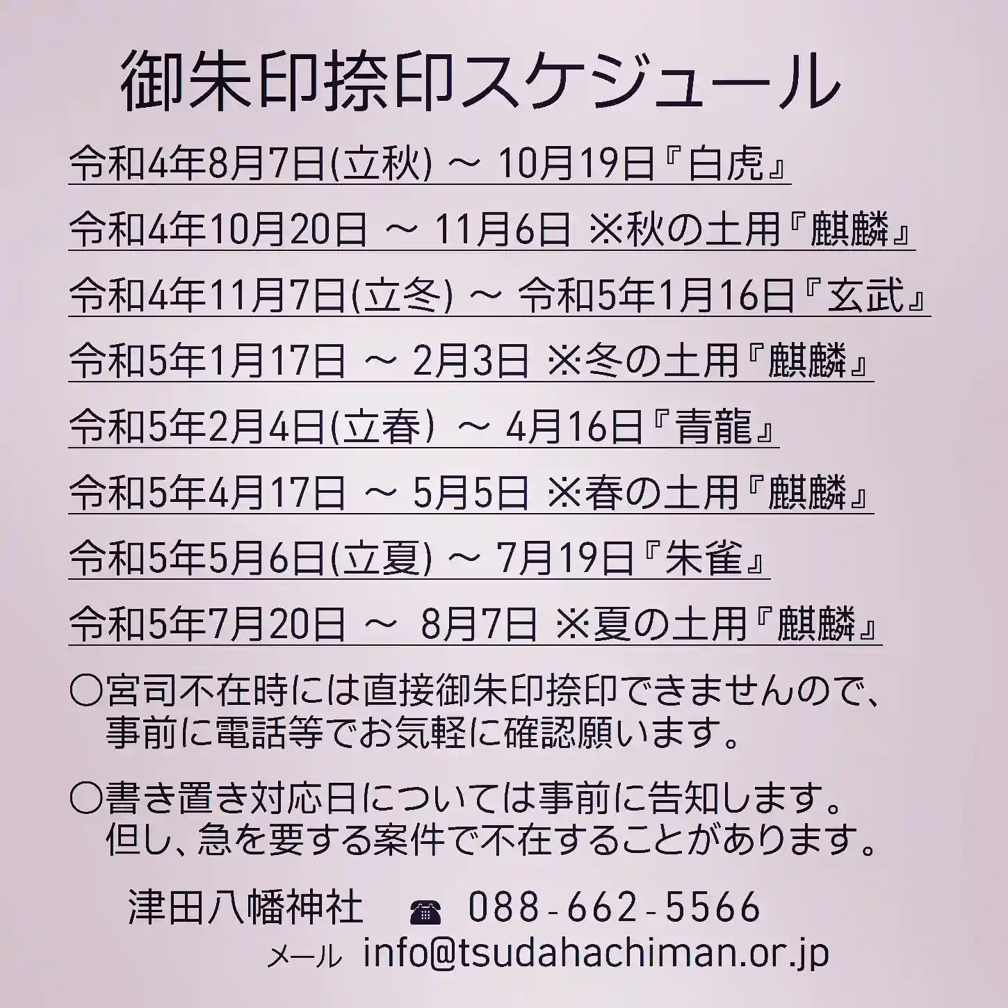 津田八幡神社「期間限定御朱印」の令和4年8月7日以降の年間スケジュールです。