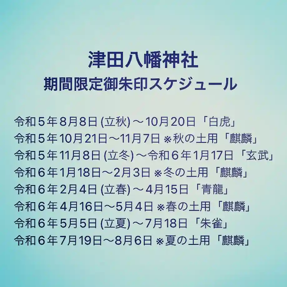 令和5年8月8日以降の津田八幡神社期間限定御朱印のスケジュールです。