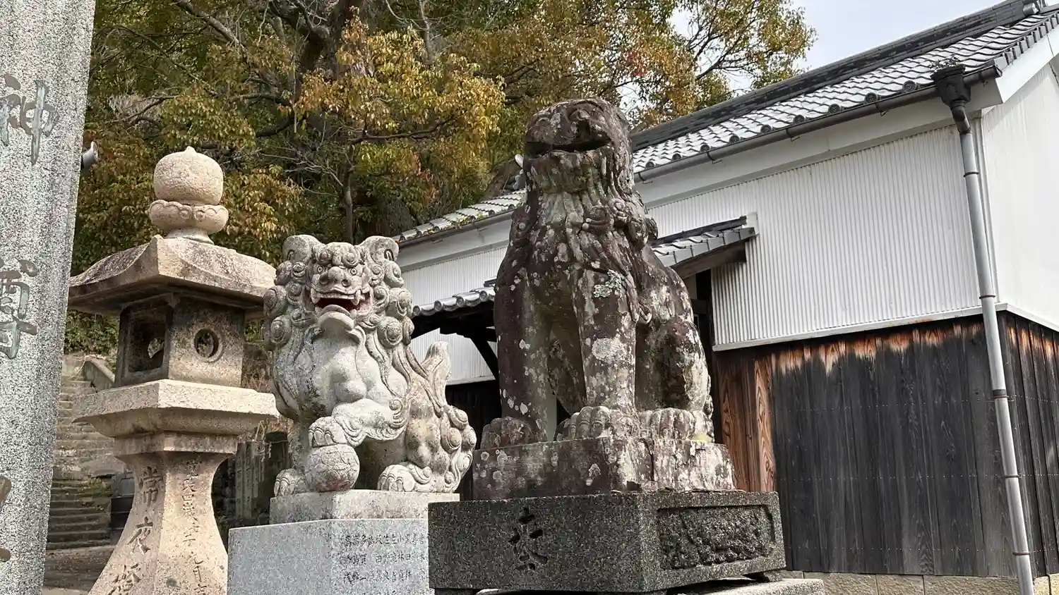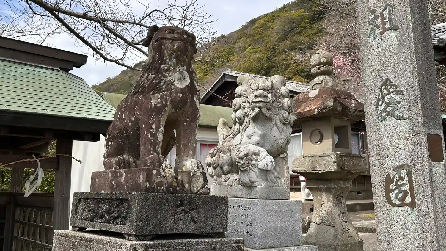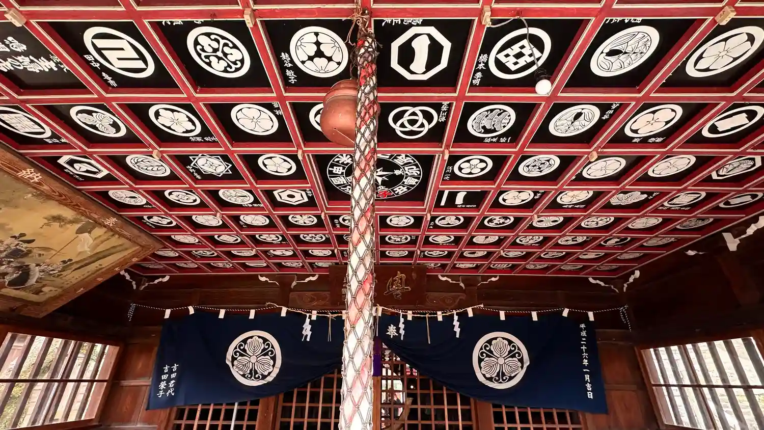 こちらの拝殿の天井も家紋! コントラストがめっちゃ渋いです。狛犬が新旧並んでいます、古いほうは崩れ…
