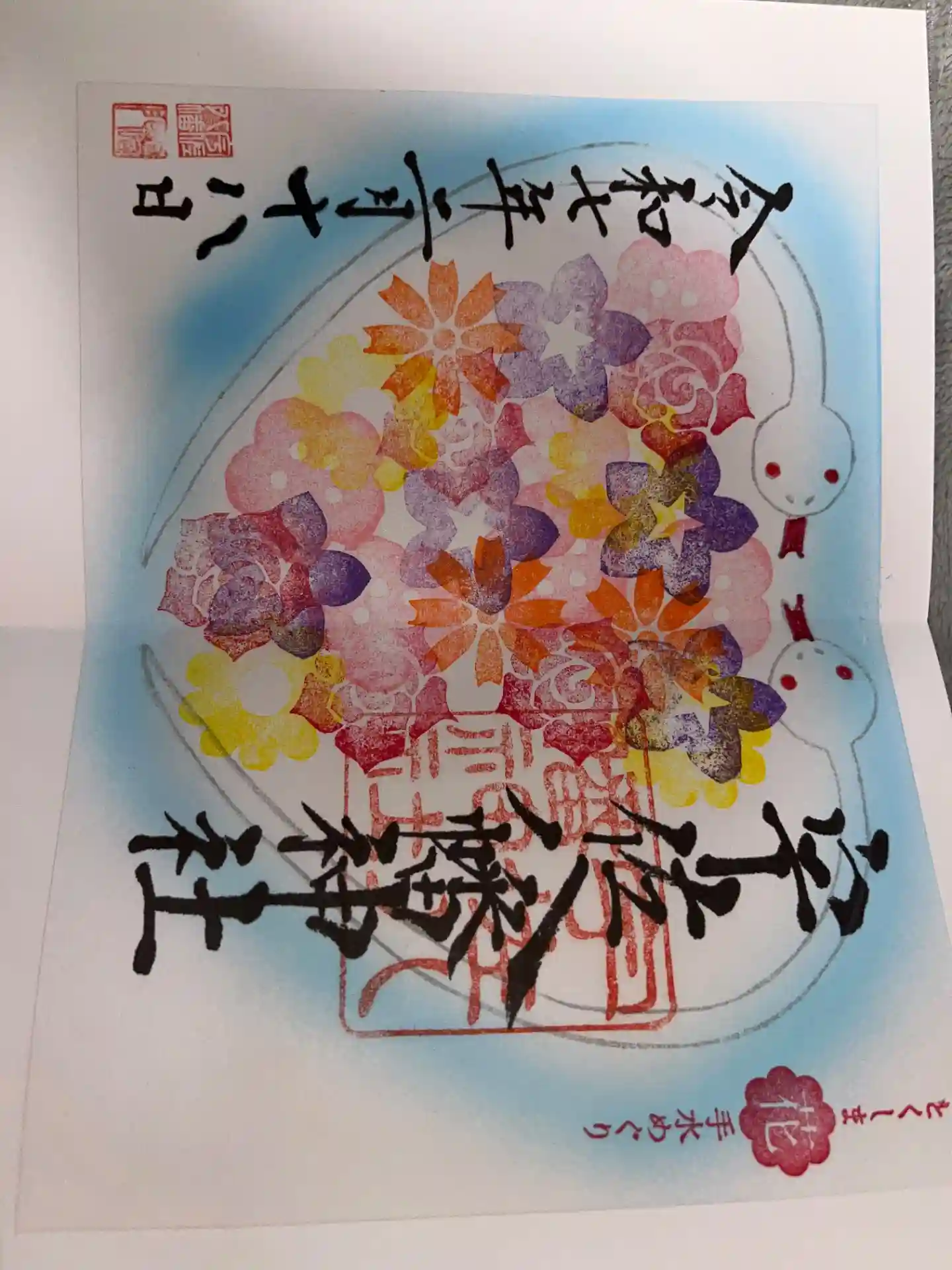こちらが花手水めぐり限定御朱印です。設置してくれているお花のスタンプを自分で押して完成。人が少なかったのでお花を溢れさせてみました