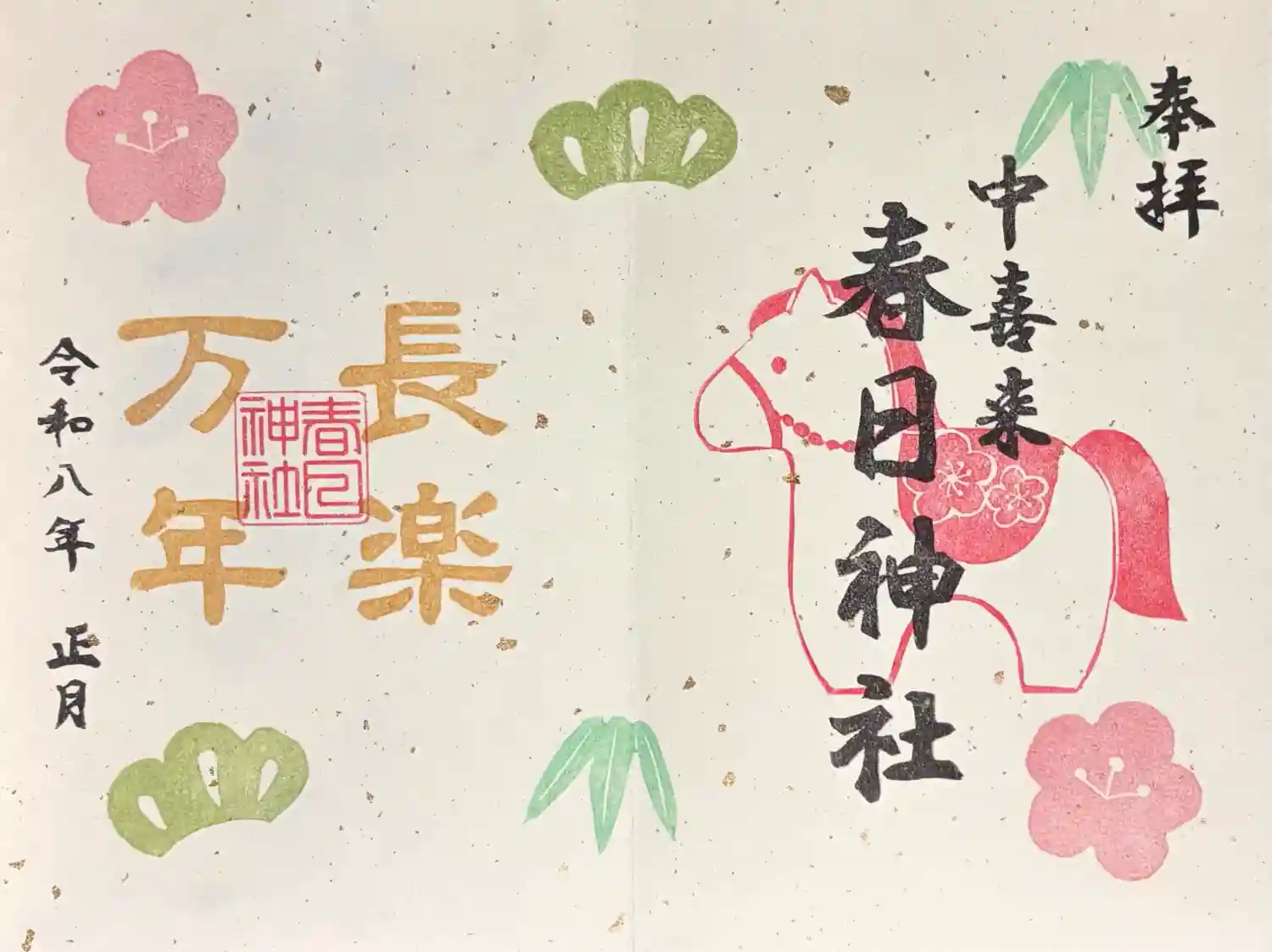 御祭神 天児屋根命、建御賀豆智命、伊渡代主命、比賣神、天照大神。元旦御朱印頂きました