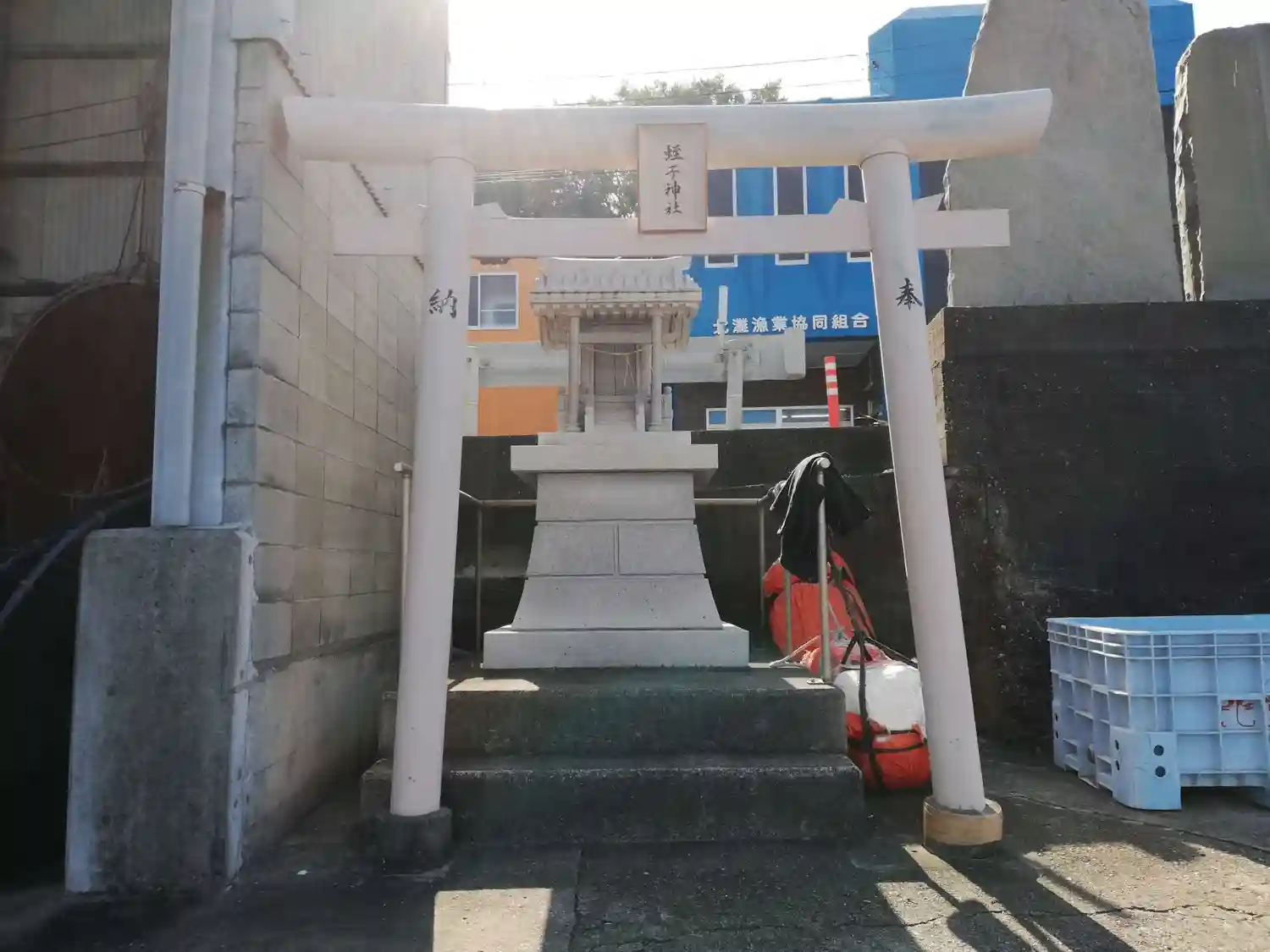 北灘漁協の青い建物と神社。間に県道が通っています。