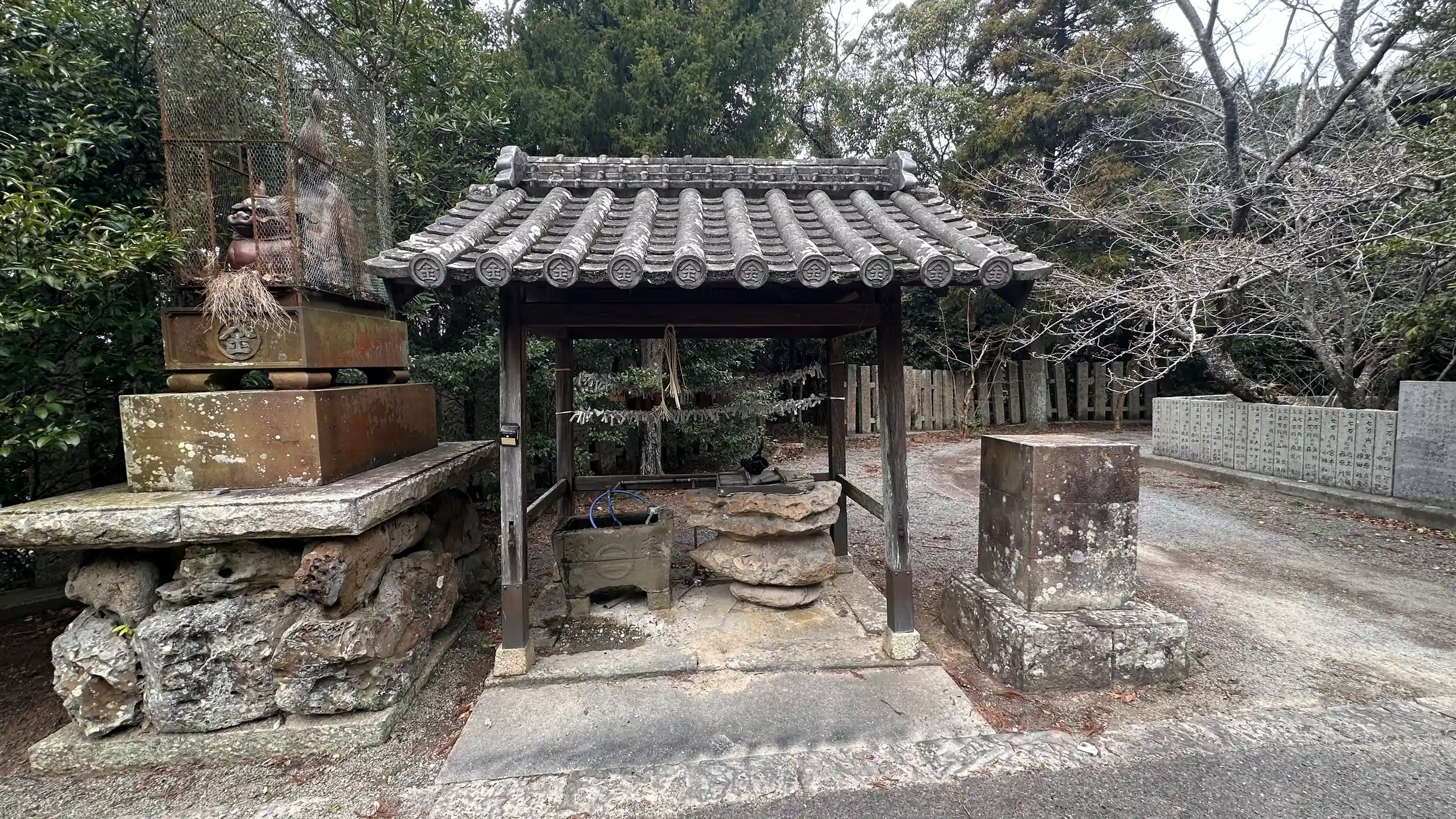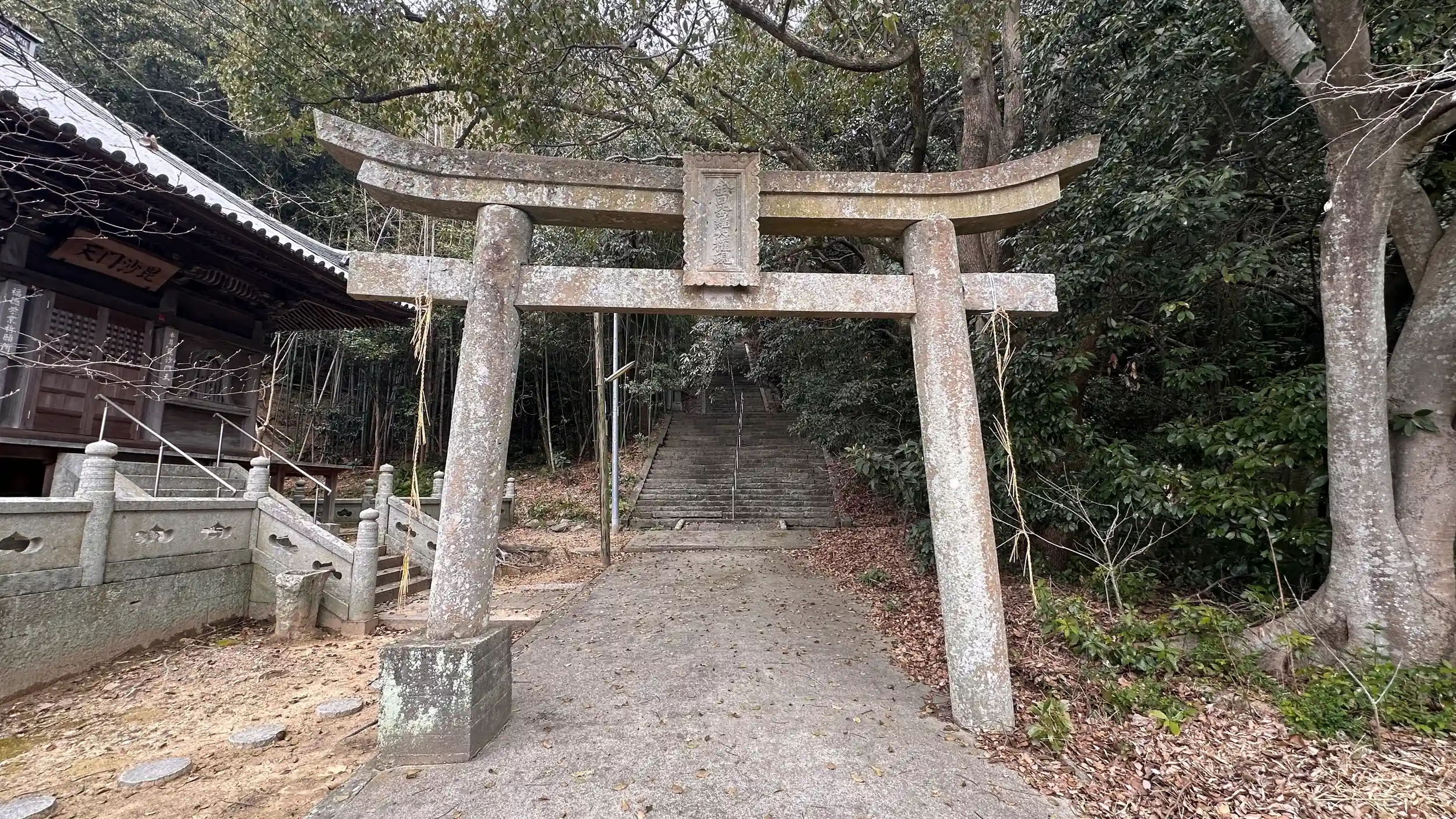 新池川の旧道沿いに鳥居があり、ご神門を抜けると、225段の急な参道の階段を上ったところに鎮座されています。本殿前の狛犬は陶器製のようです。見晴らしも良く淡路島、和歌山迄見えます。