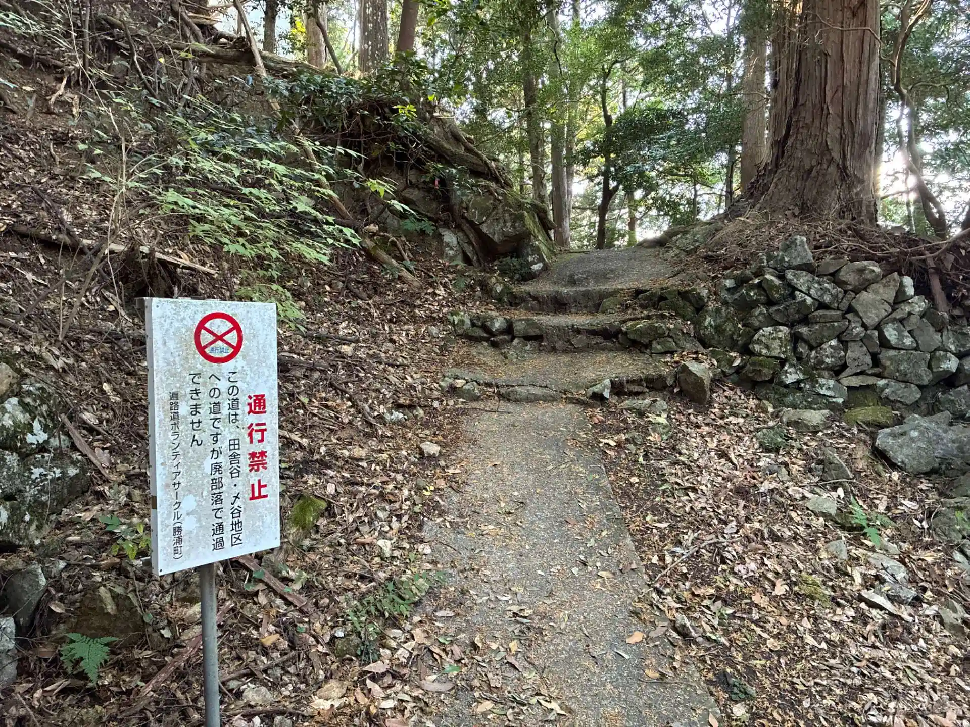 なんと通行禁止の看板。昔の集落へ続く道のようです。山頂までなのでそのまま進みました。ごめんなさい。