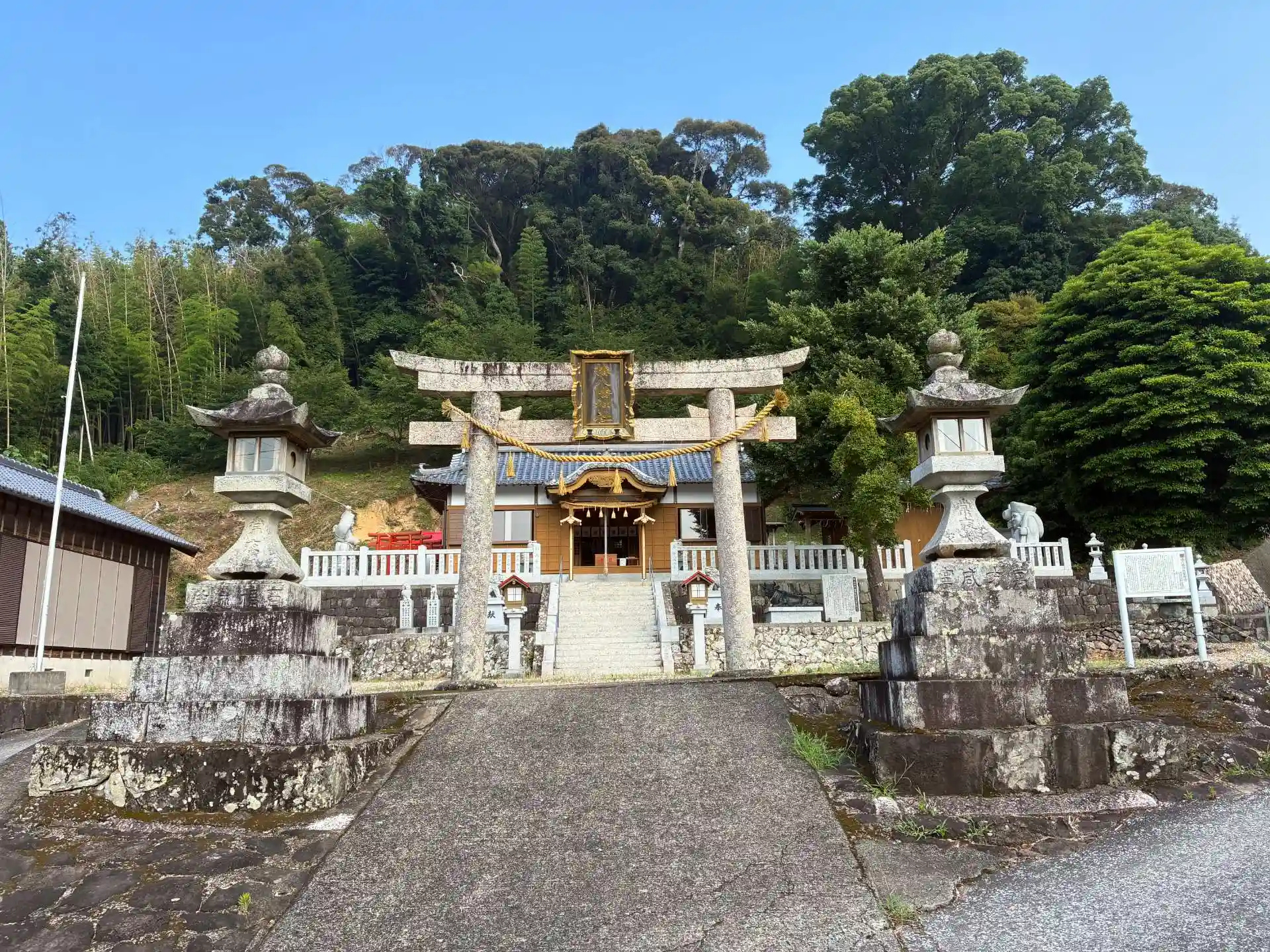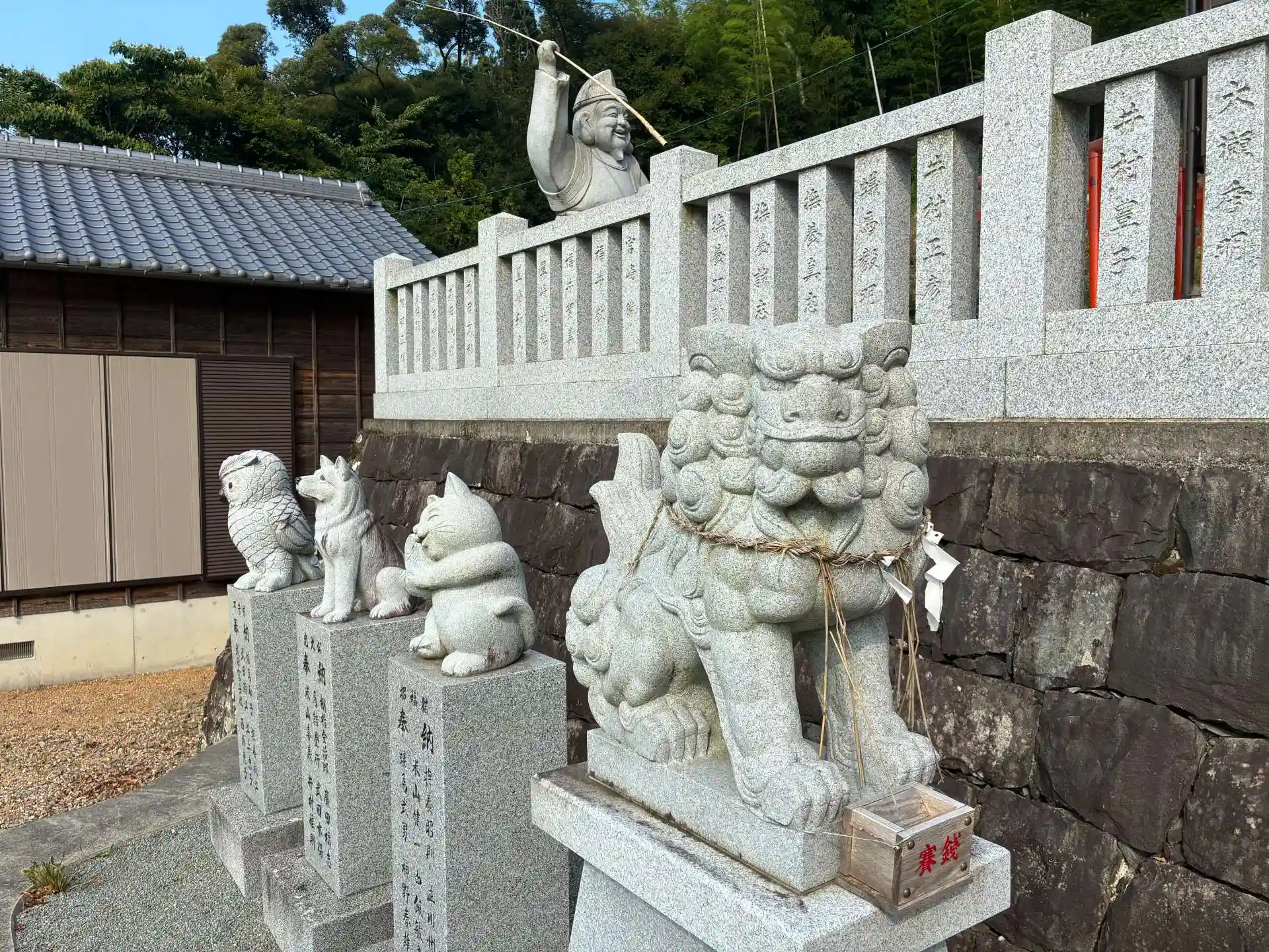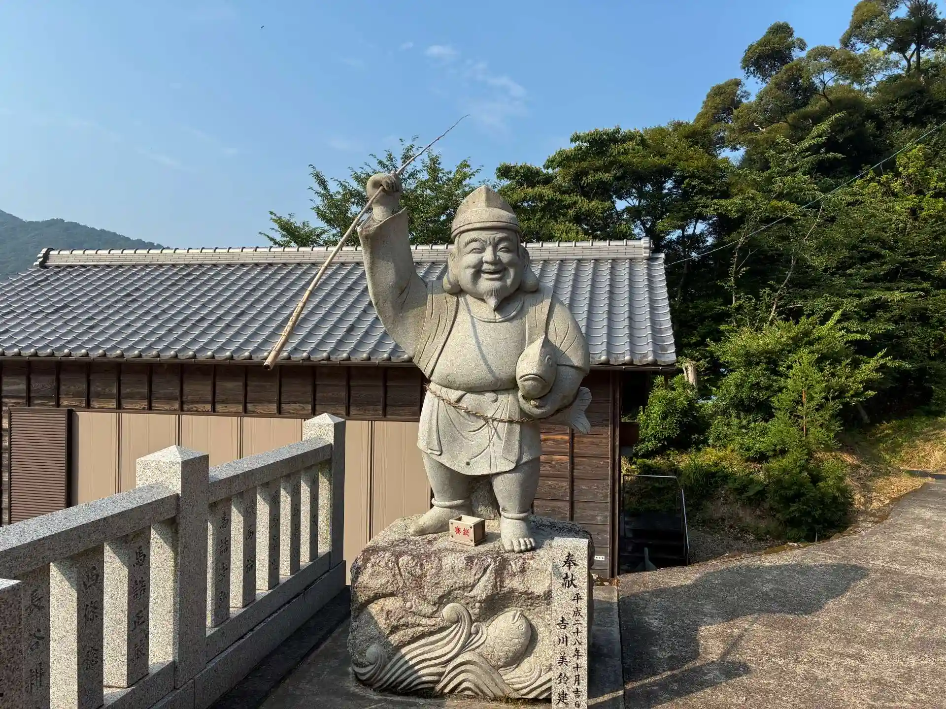 こちらの常夜灯は安政の南海地震の記録が残されており、国登録の記念物に指定されているようでかなり立派ですね。また、境内には巨大な恵比須様と大黒天の石像もあり地元の氏子さんの熱い信仰を感じました。お相撲さんの石像は?でしたが、面白い神社でした。