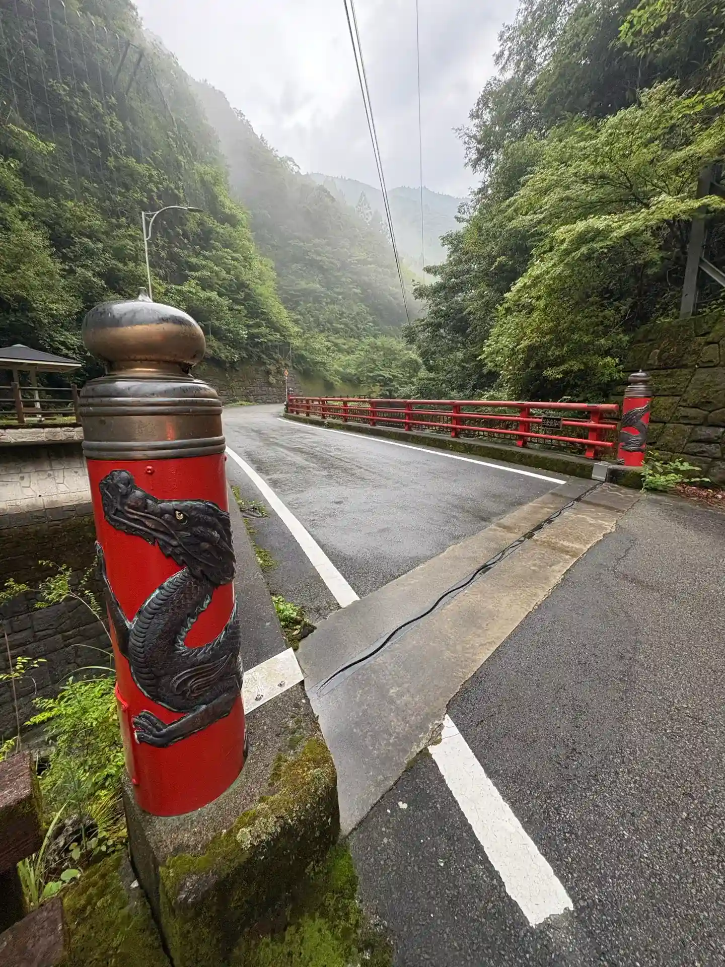 狭幅な連続したカーブを走ると朱色の龍の橋が現れる。