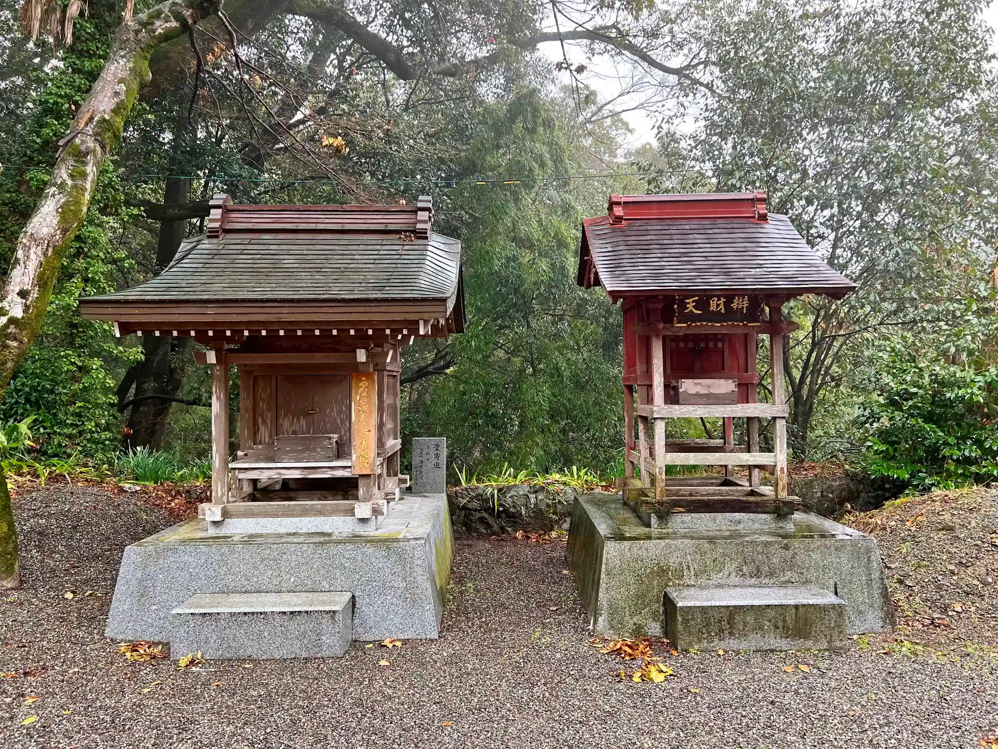 本堂の右手にある<弁財天>(右)と<***菩薩の小社>(左)。小社の表札が読めない...(^_^;)