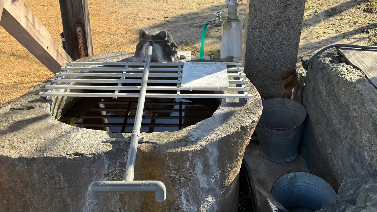 こちらの神社のうりはカエルですね。あちこちにカエルの石像がおかれていま…